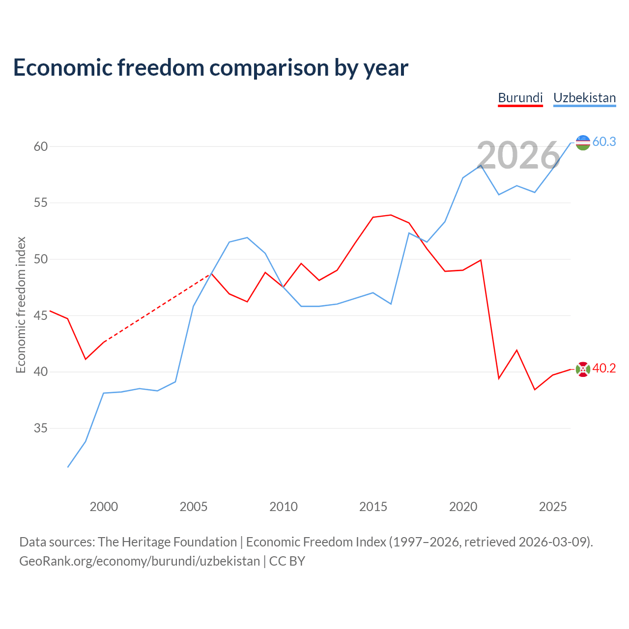 The Economic Freedom Index for Burundi is 40.2, ranking 187/197, compared to 60.3 for Uzbekistan, ranking 94/197. The chart above displays a comparison of annual changes in economic freedom indexes.