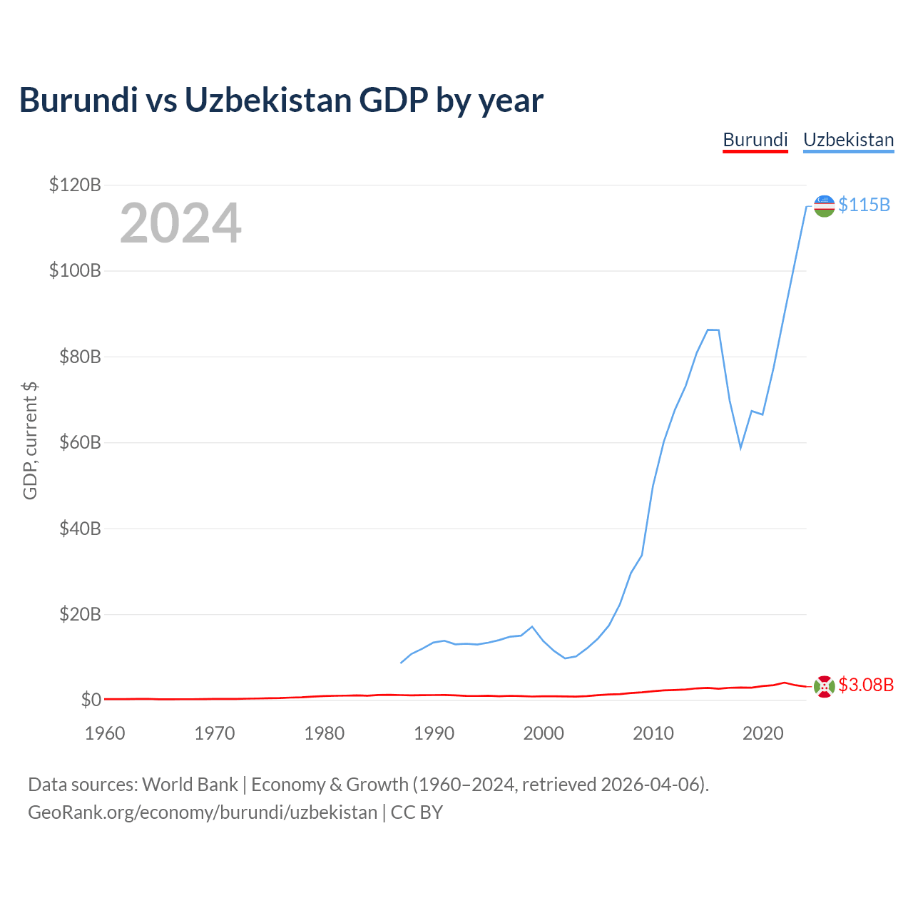 Burundi has a GDP of $3.08B compared to $115B for Uzbekistan, ranking 169/197 and 66/197 by economy size, respectively.