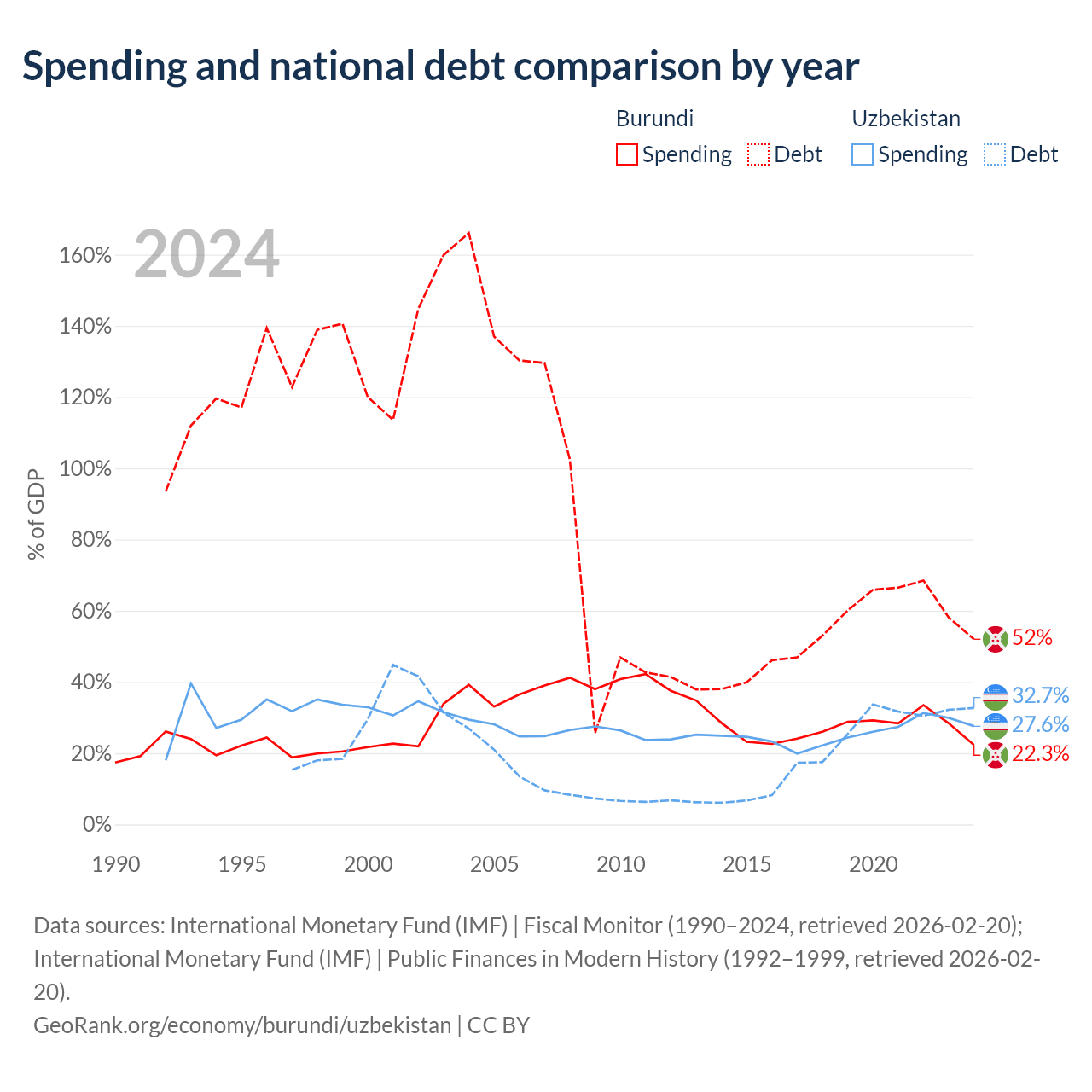 Burundi has $1.6B in government debt (52% of GDP), compared to $37.5B (32.7% of GDP) in Uzbekistan.
