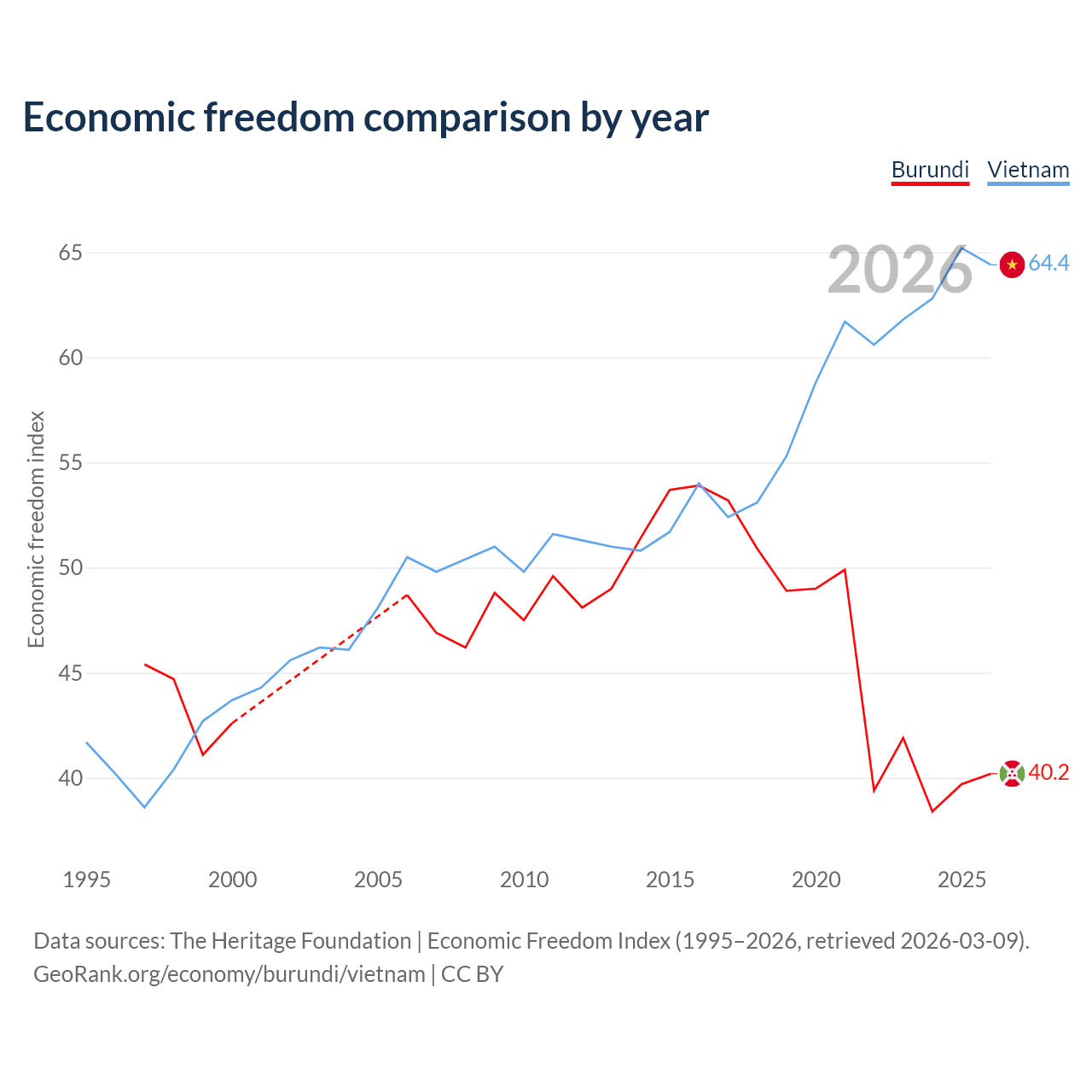 The Economic Freedom Index for Burundi is 40.2, ranking 187/197, compared to 64.4 for Vietnam, ranking 73/197. The chart above displays a comparison of annual changes in economic freedom indexes.