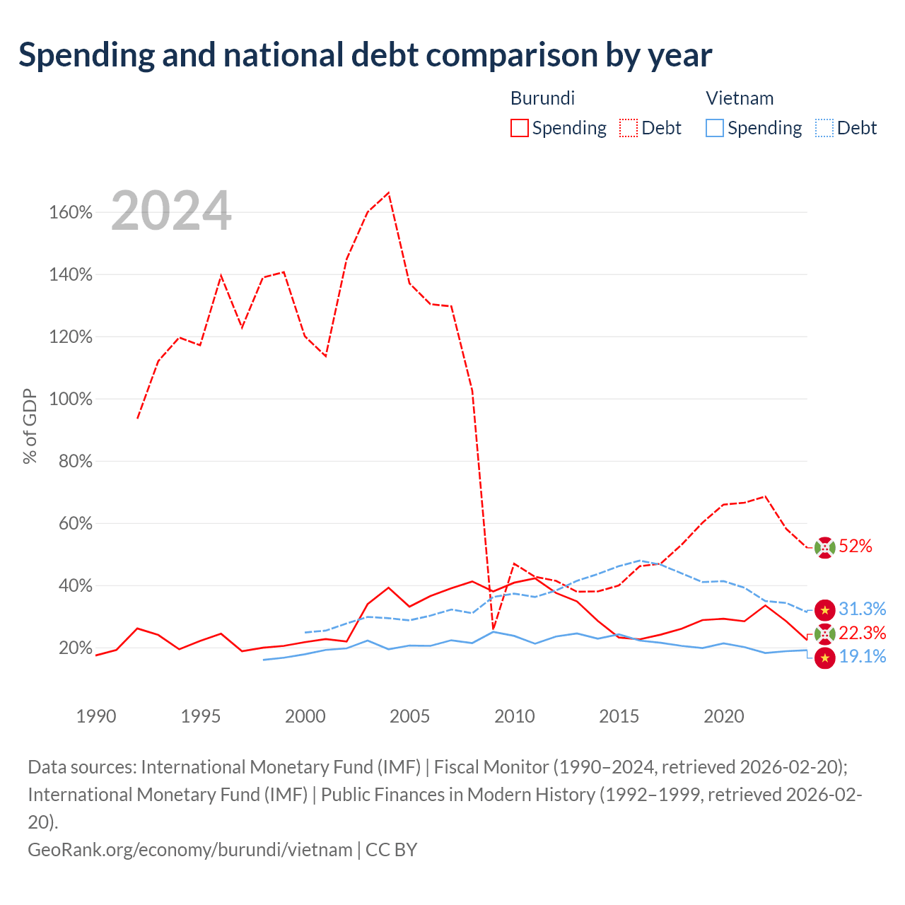 Burundi has $1.6B in government debt (52% of GDP), compared to $149B (31.3% of GDP) in Vietnam.