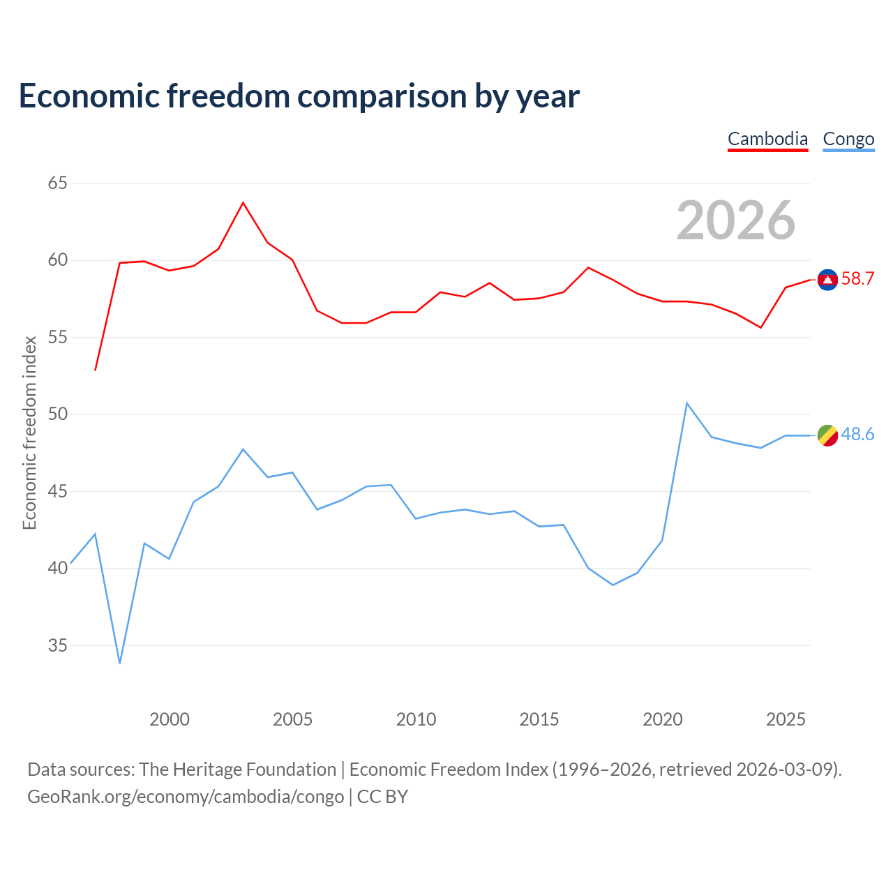 The Economic Freedom Index for Cambodia is 58.7, ranking 108/197, compared to 48.6 for the Congo, ranking 169/197. The chart above displays a comparison of annual changes in economic freedom indexes.