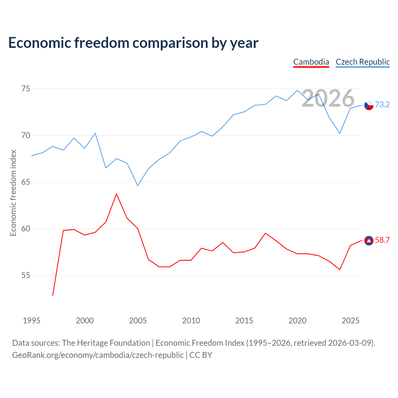 The Economic Freedom Index for Cambodia is 58.7, ranking 108/197, compared to 73.2 for the Czech Republic, ranking 25/197. The chart above displays a comparison of annual changes in economic freedom indexes.