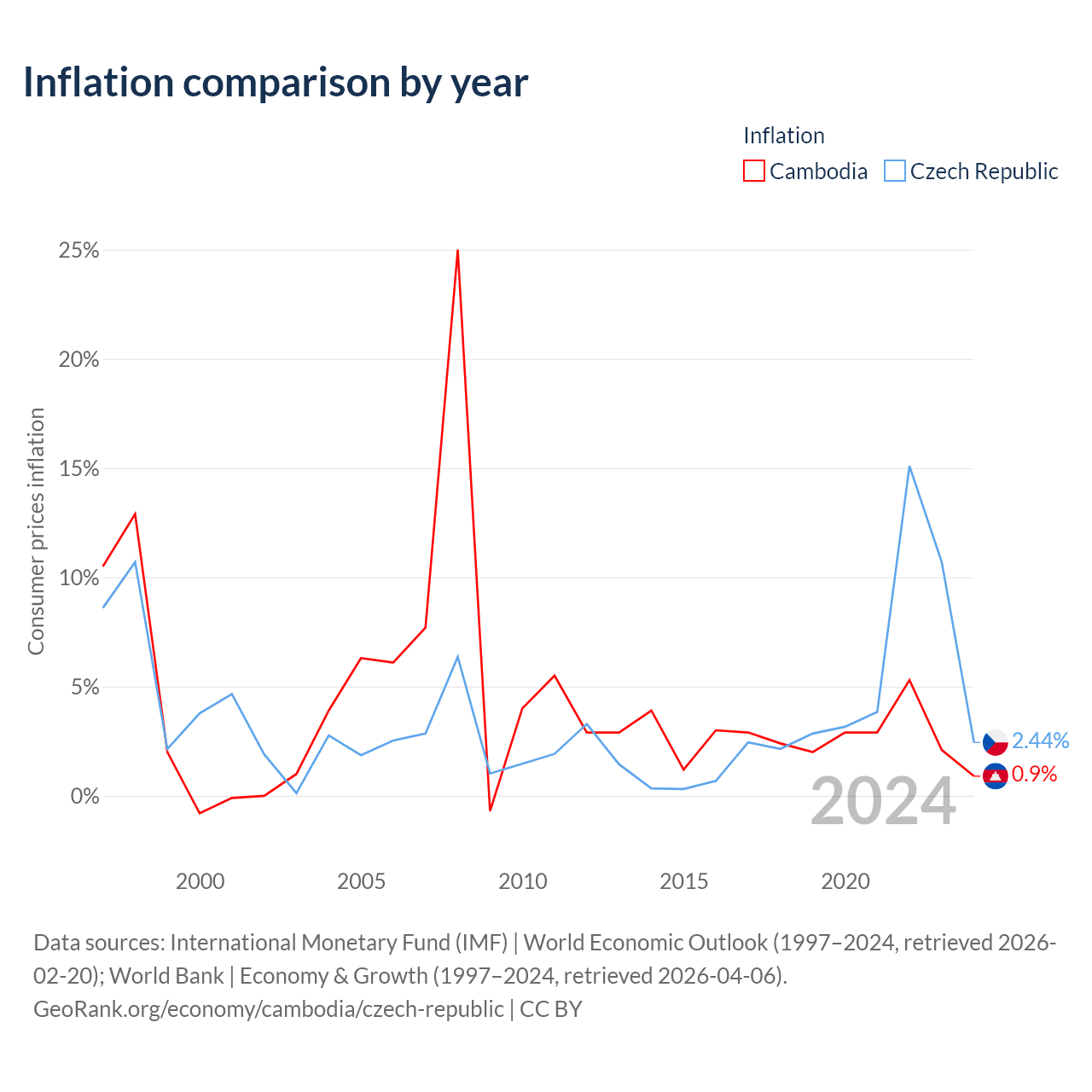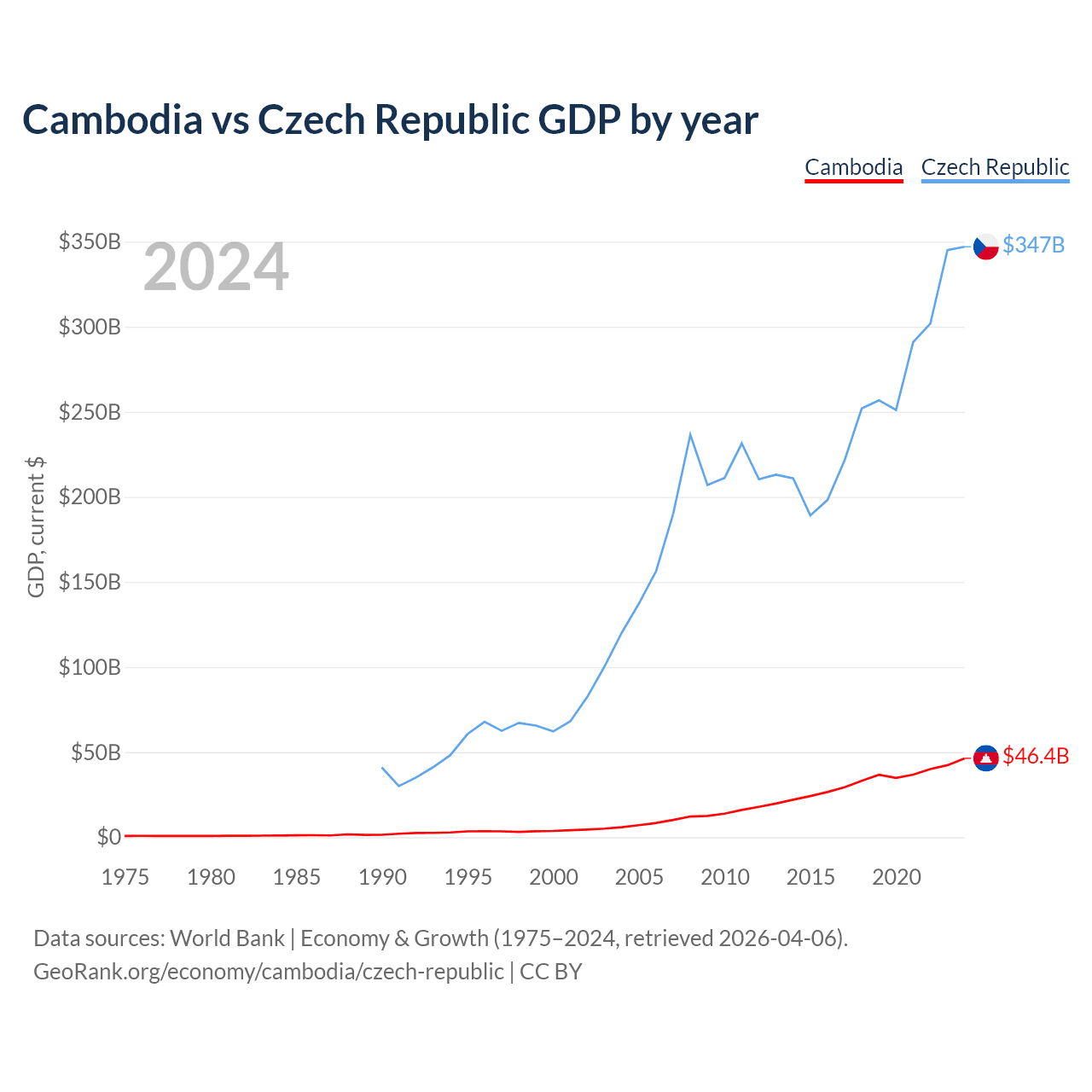 Cambodia has a GDP of $46.4B compared to $347B for the Czech Republic, ranking 97/197 and 44/197 by economy size, respectively.