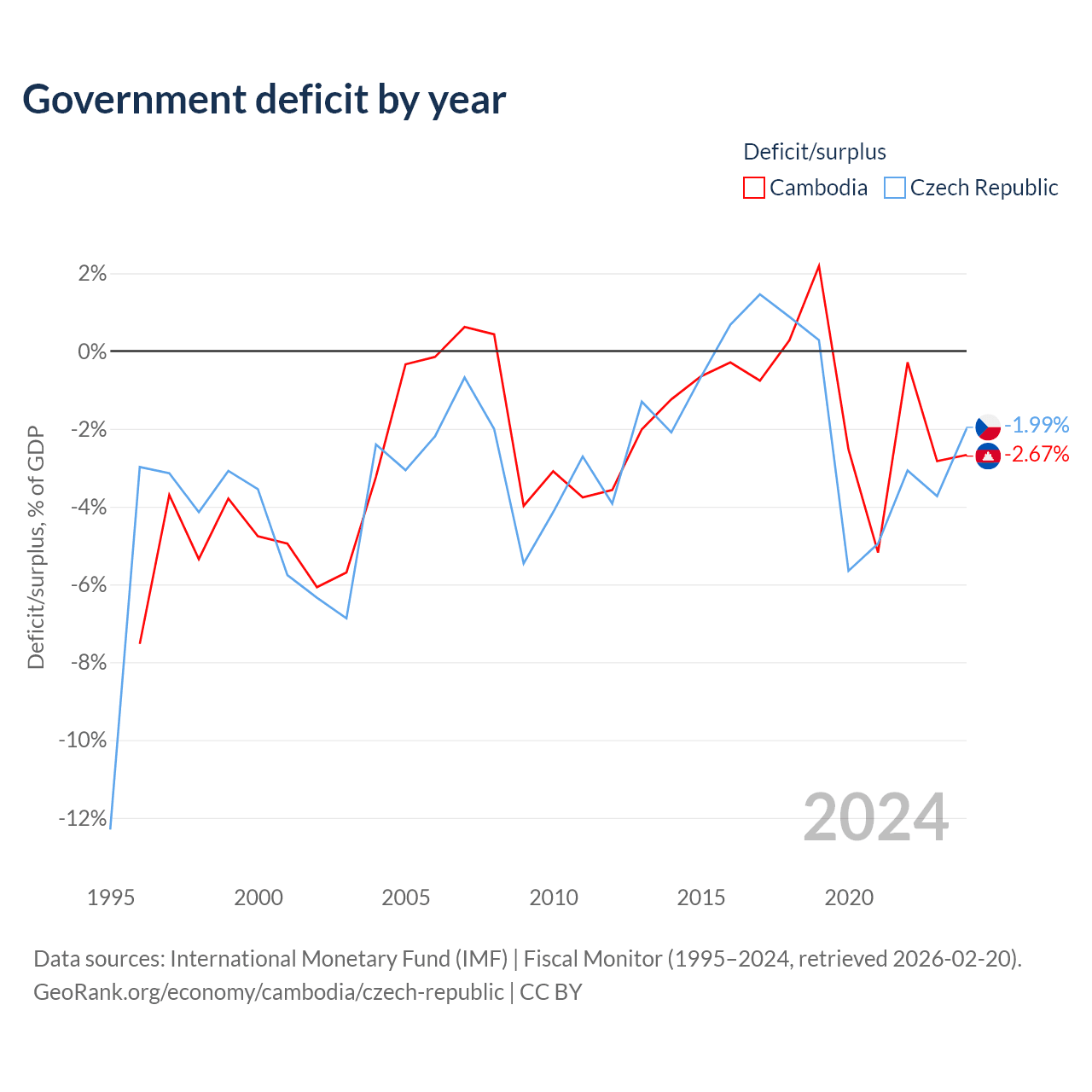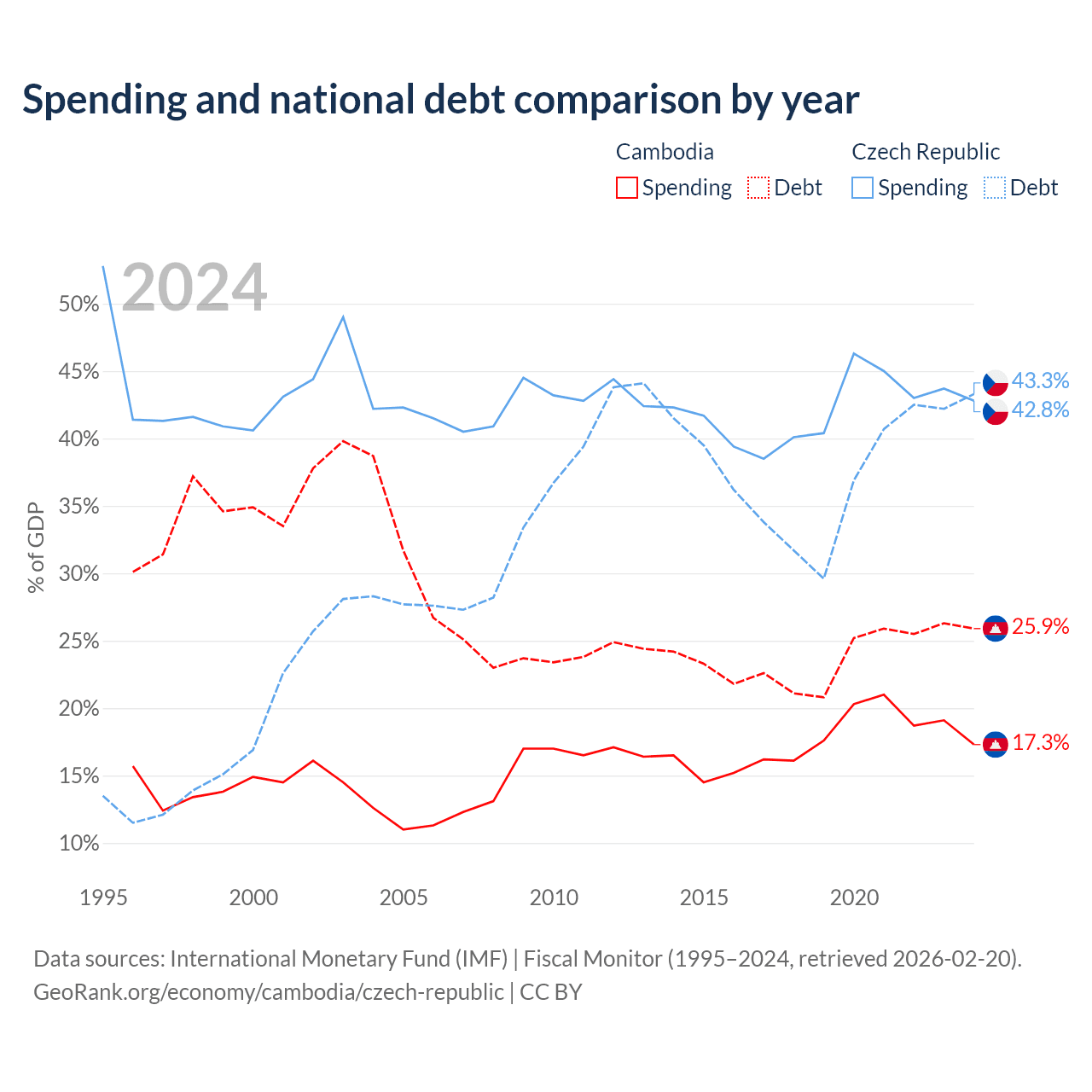 Cambodia has $12B in government debt (25.9% of GDP), compared to $150B (43.3% of GDP) in the Czech Republic.