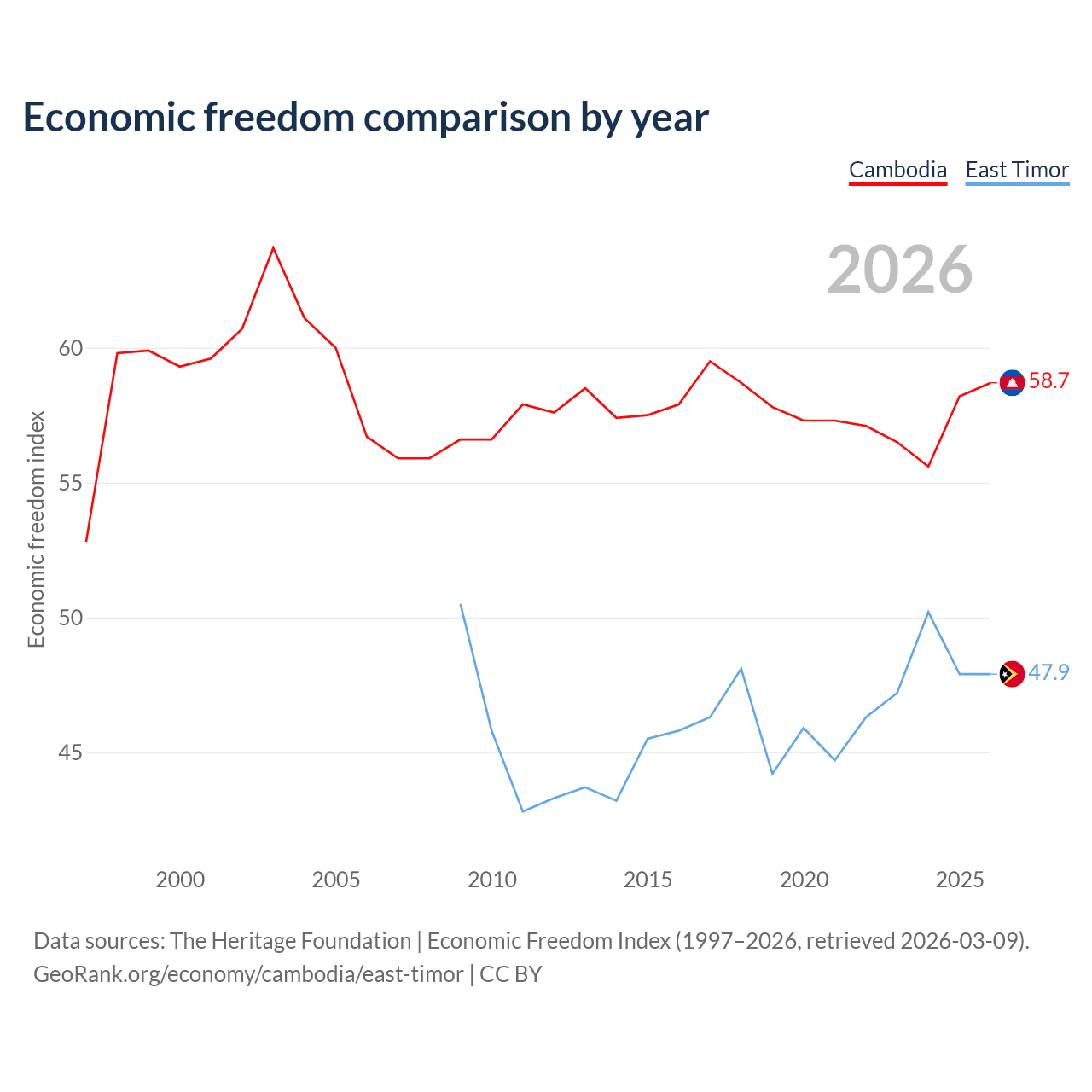 The Economic Freedom Index for Cambodia is 58.7, ranking 108/197, compared to 47.9 for East Timor, ranking 173/197. The chart above displays a comparison of annual changes in economic freedom indexes.