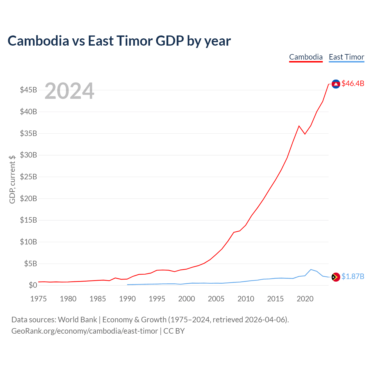 Cambodia has a GDP of $46.4B compared to $1.87B for East Timor, ranking 97/197 and 181/197 by economy size, respectively.