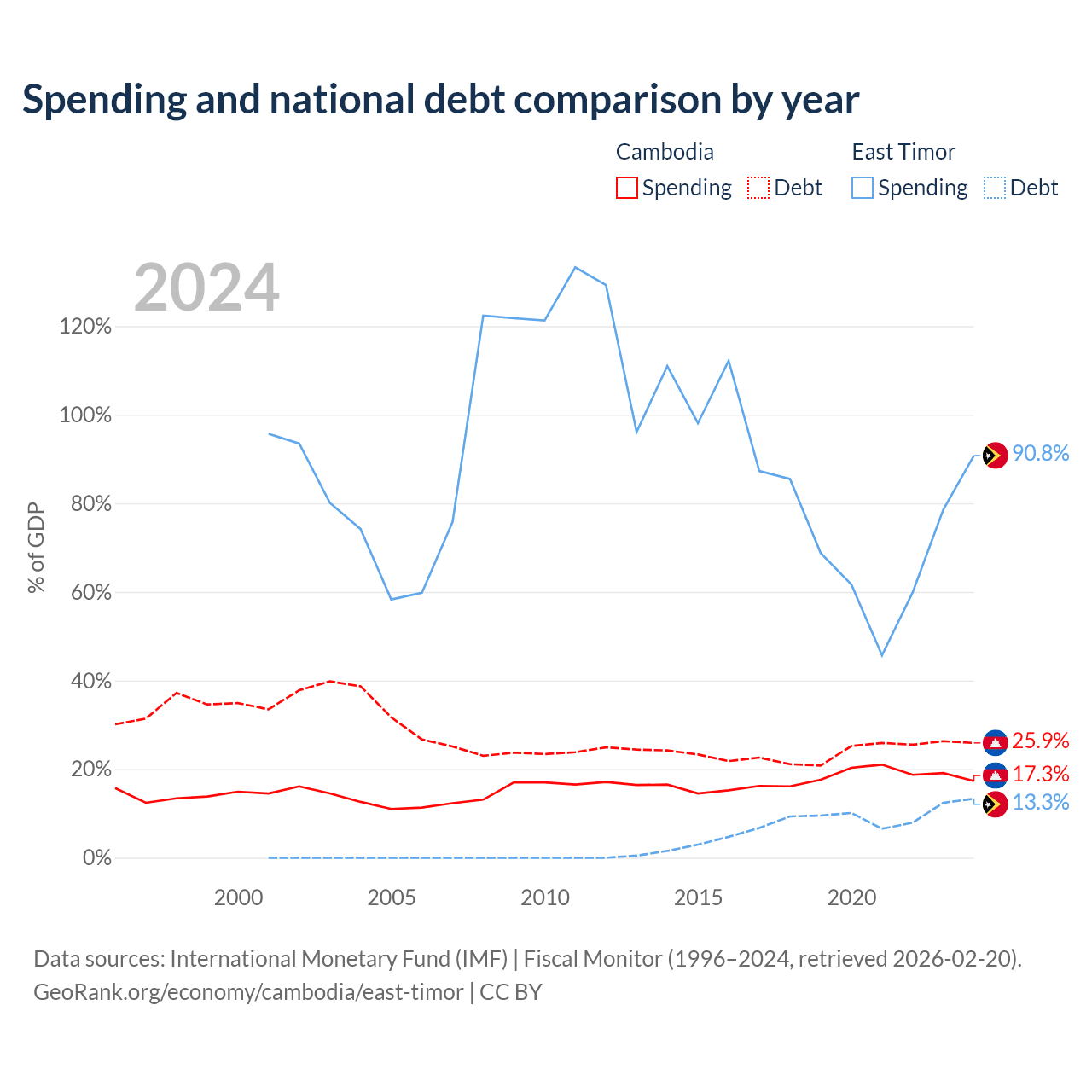 Cambodia has $12B in government debt (25.9% of GDP), compared to $249M (13.3% of GDP) in East Timor.