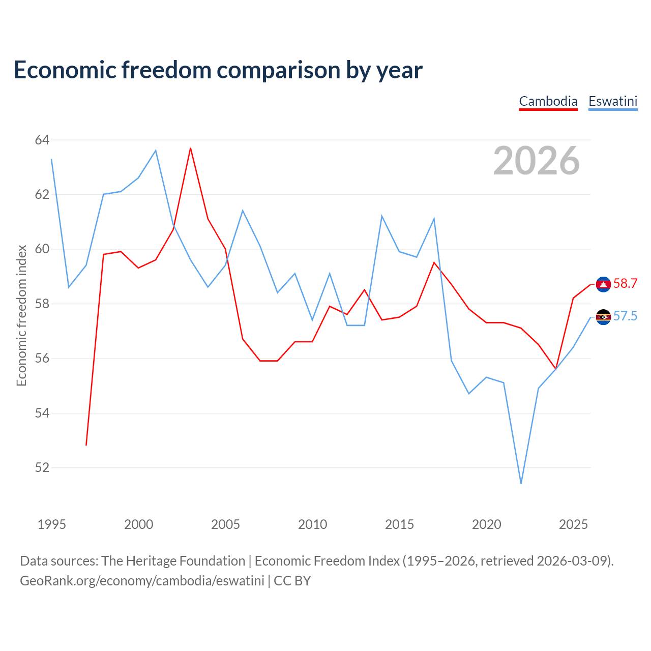 The Economic Freedom Index for Cambodia is 58.7, ranking 108/197, compared to 57.5 for Eswatini, ranking 116/197. The chart above displays a comparison of annual changes in economic freedom indexes.