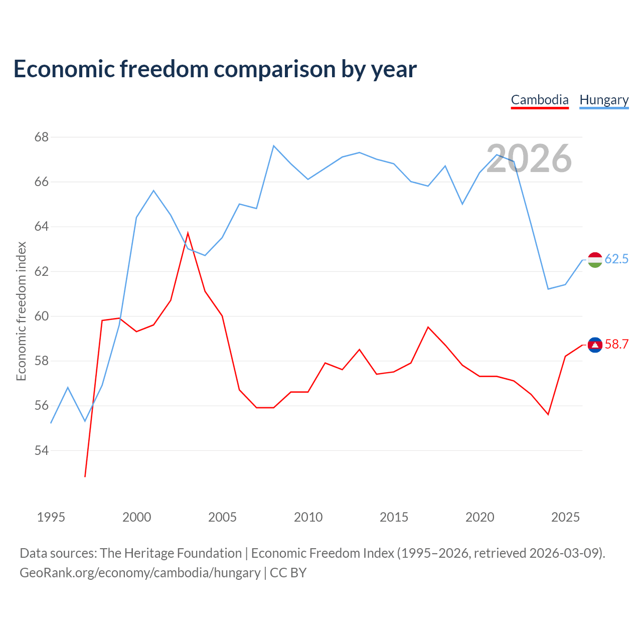 The Economic Freedom Index for Cambodia is 58.7, ranking 108/197, compared to 62.5 for Hungary, ranking 86/197. The chart above displays a comparison of annual changes in economic freedom indexes.