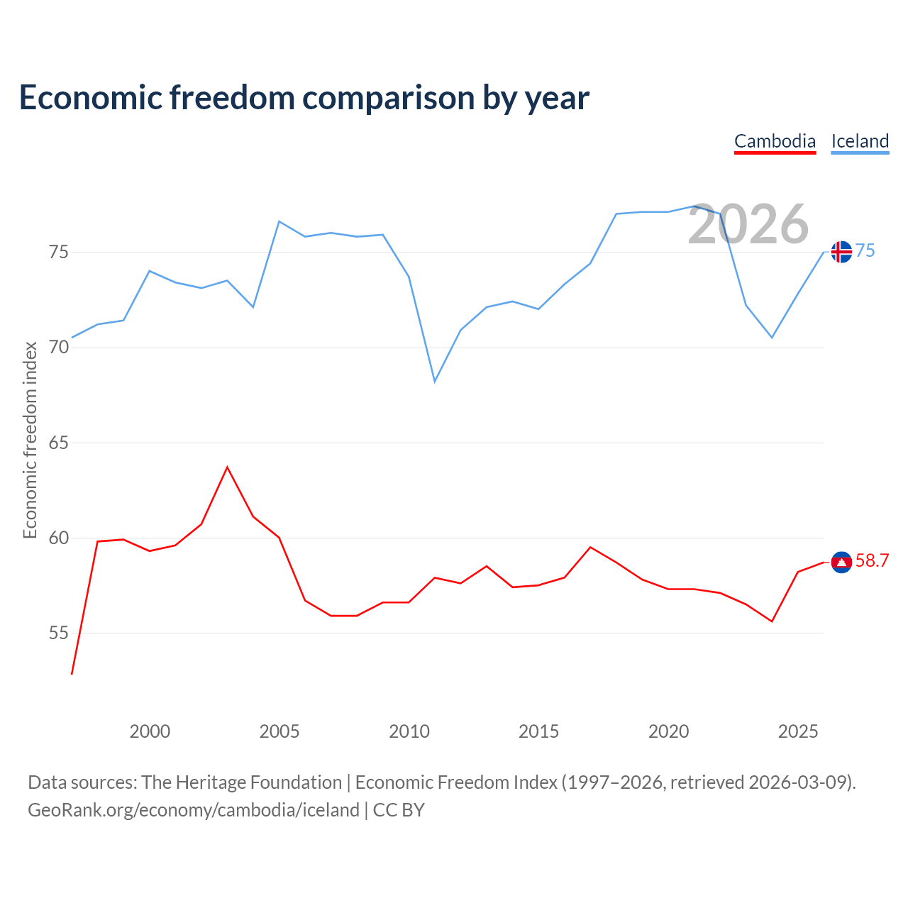 The Economic Freedom Index for Cambodia is 58.7, ranking 108/197, compared to 75 for Iceland, ranking 19/197. The chart above displays a comparison of annual changes in economic freedom indexes.