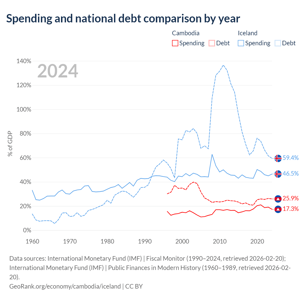 Cambodia has $12B in government debt (25.9% of GDP), compared to $19.8B (59.4% of GDP) in Iceland.