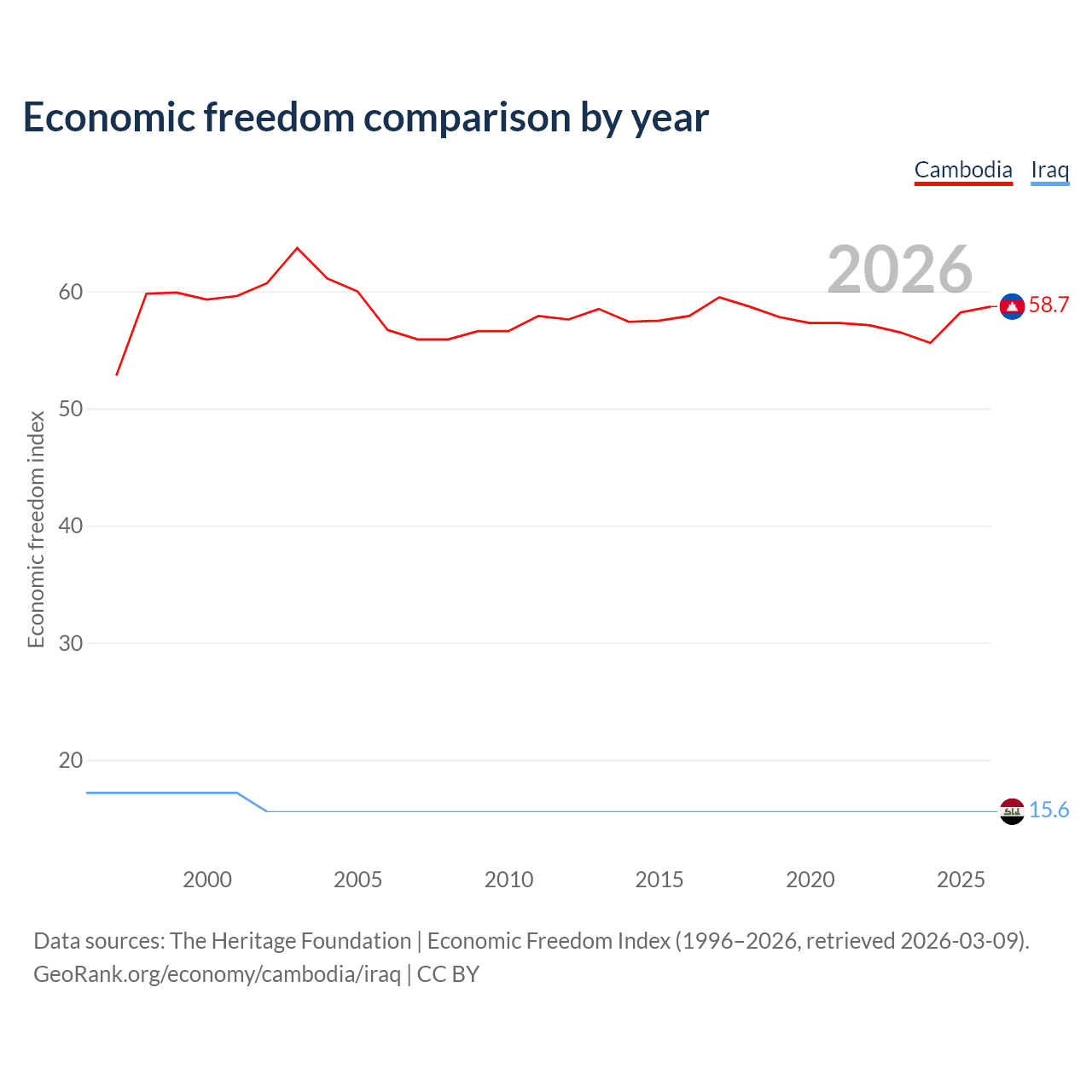 The Economic Freedom Index for Cambodia is 58.7, ranking 108/197, compared to 15.6 for Iraq, ranking 196/197. The chart above displays a comparison of annual changes in economic freedom indexes.