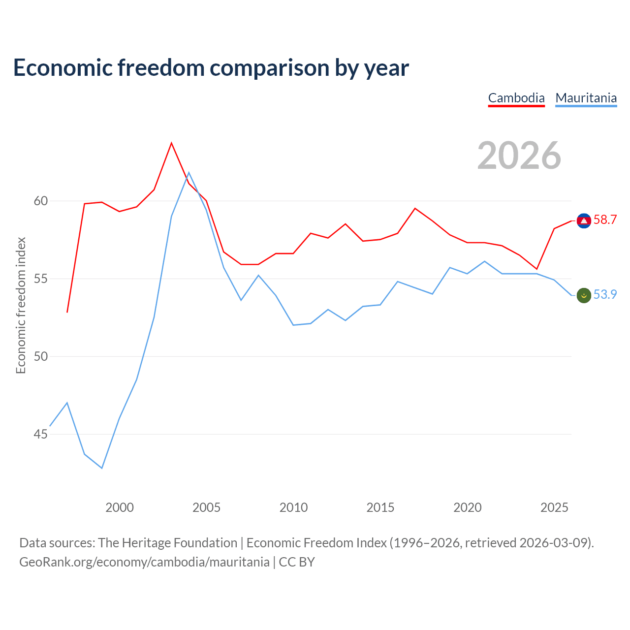 The Economic Freedom Index for Cambodia is 58.7, ranking 108/197, compared to 53.9 for Mauritania, ranking 136/197. The chart above displays a comparison of annual changes in economic freedom indexes.