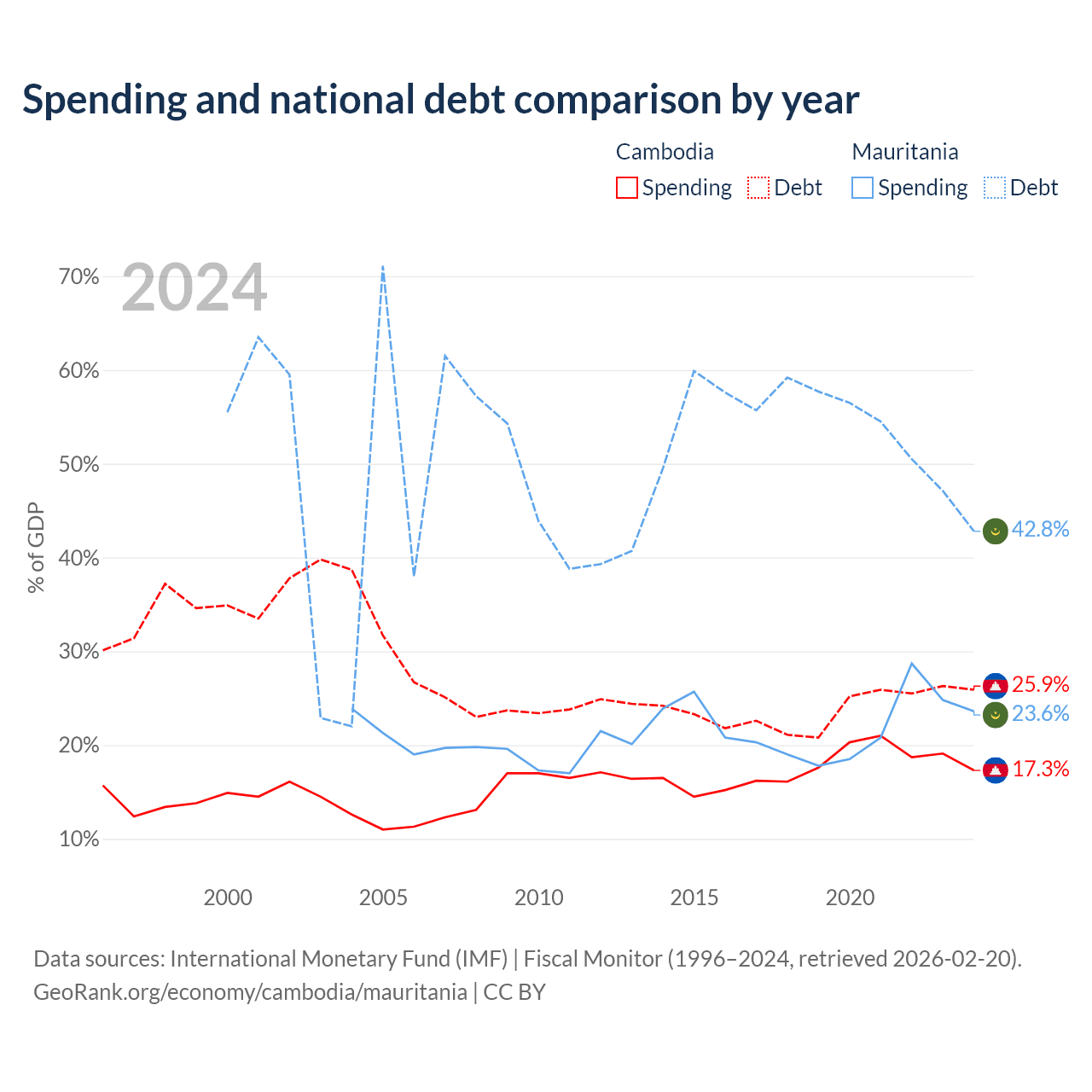 Cambodia has $12B in government debt (25.9% of GDP), compared to $4.67B (42.8% of GDP) in Mauritania.