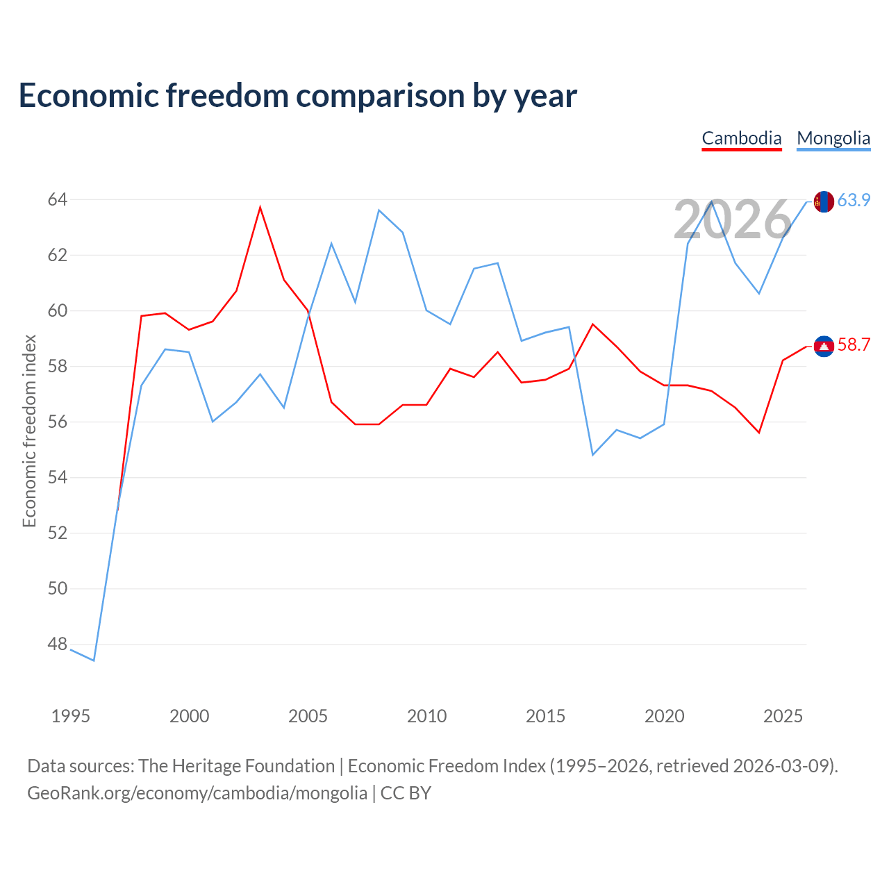 The Economic Freedom Index for Cambodia is 58.7, ranking 108/197, compared to 63.9 for Mongolia, ranking 76/197. The chart above displays a comparison of annual changes in economic freedom indexes.