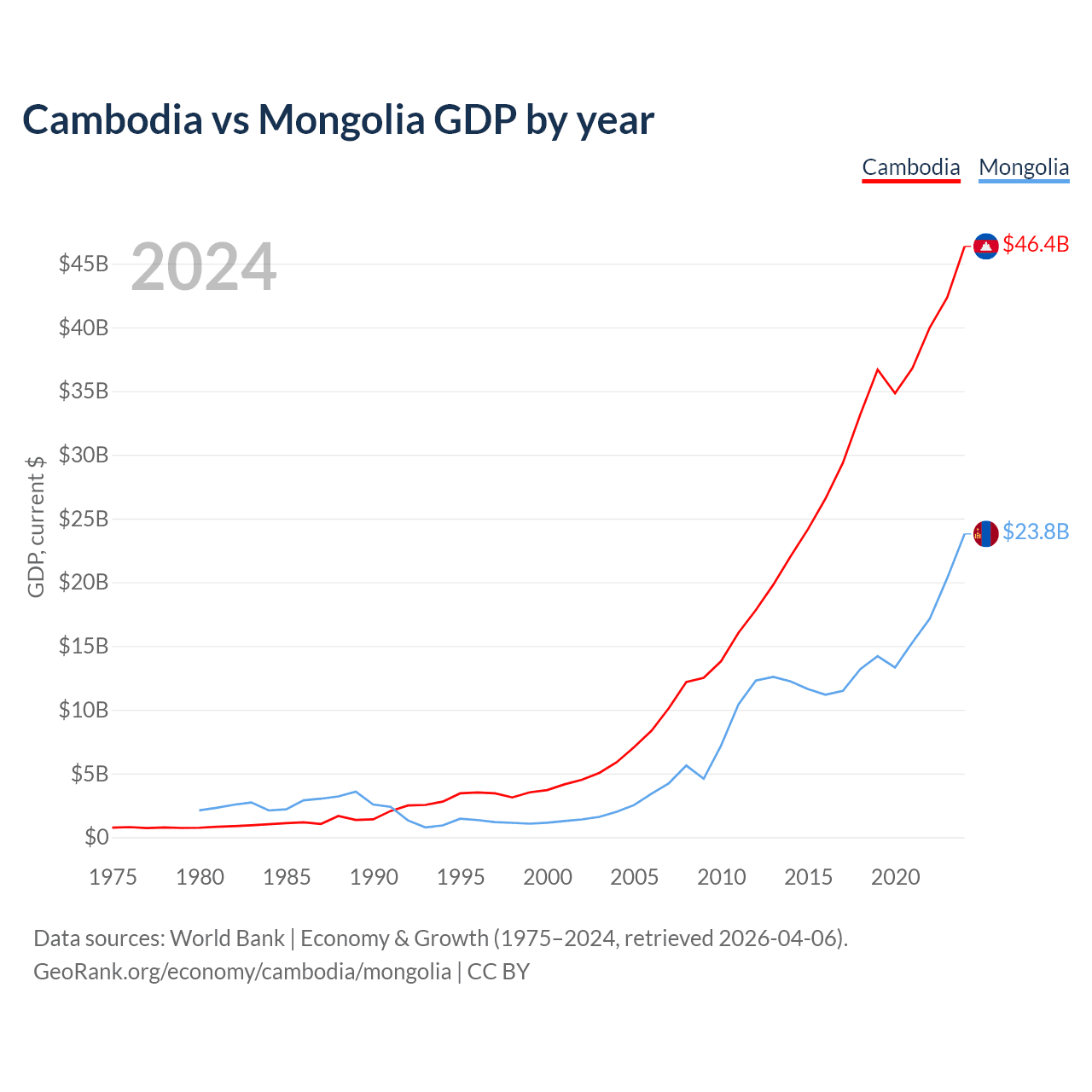 Cambodia vs Mongolia GDP by year