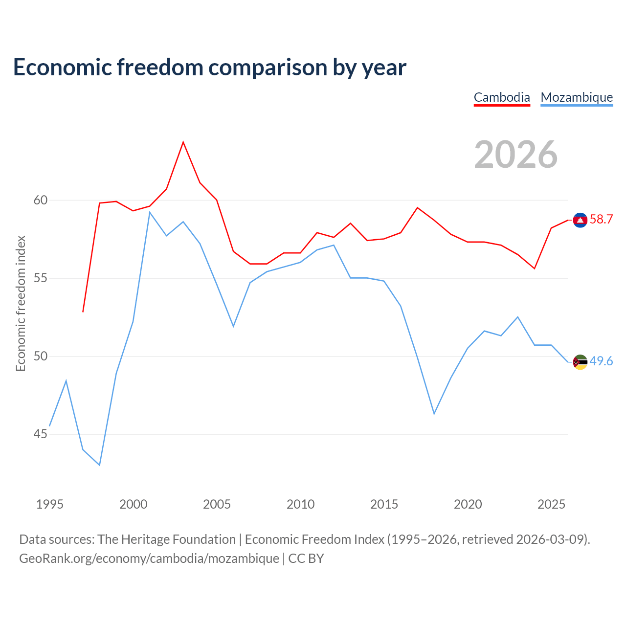 The Economic Freedom Index for Cambodia is 58.7, ranking 108/197, compared to 49.6 for Mozambique, ranking 164/197. The chart above displays a comparison of annual changes in economic freedom indexes.