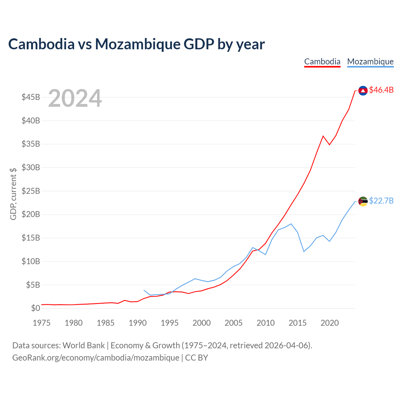 Cambodia has a GDP of $46.4B compared to $22.7B for Mozambique, ranking 97/197 and 123/197 by economy size, respectively.