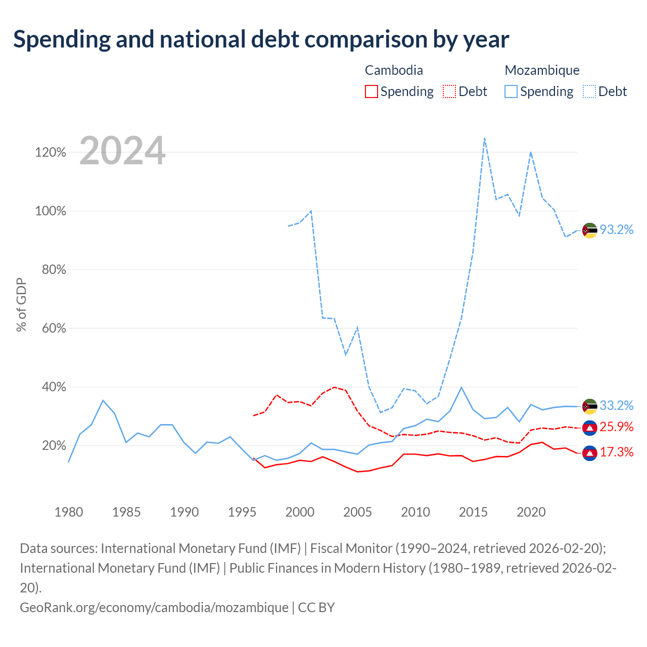 Cambodia has $12B in government debt (25.9% of GDP), compared to $21.2B (93.2% of GDP) in Mozambique.
