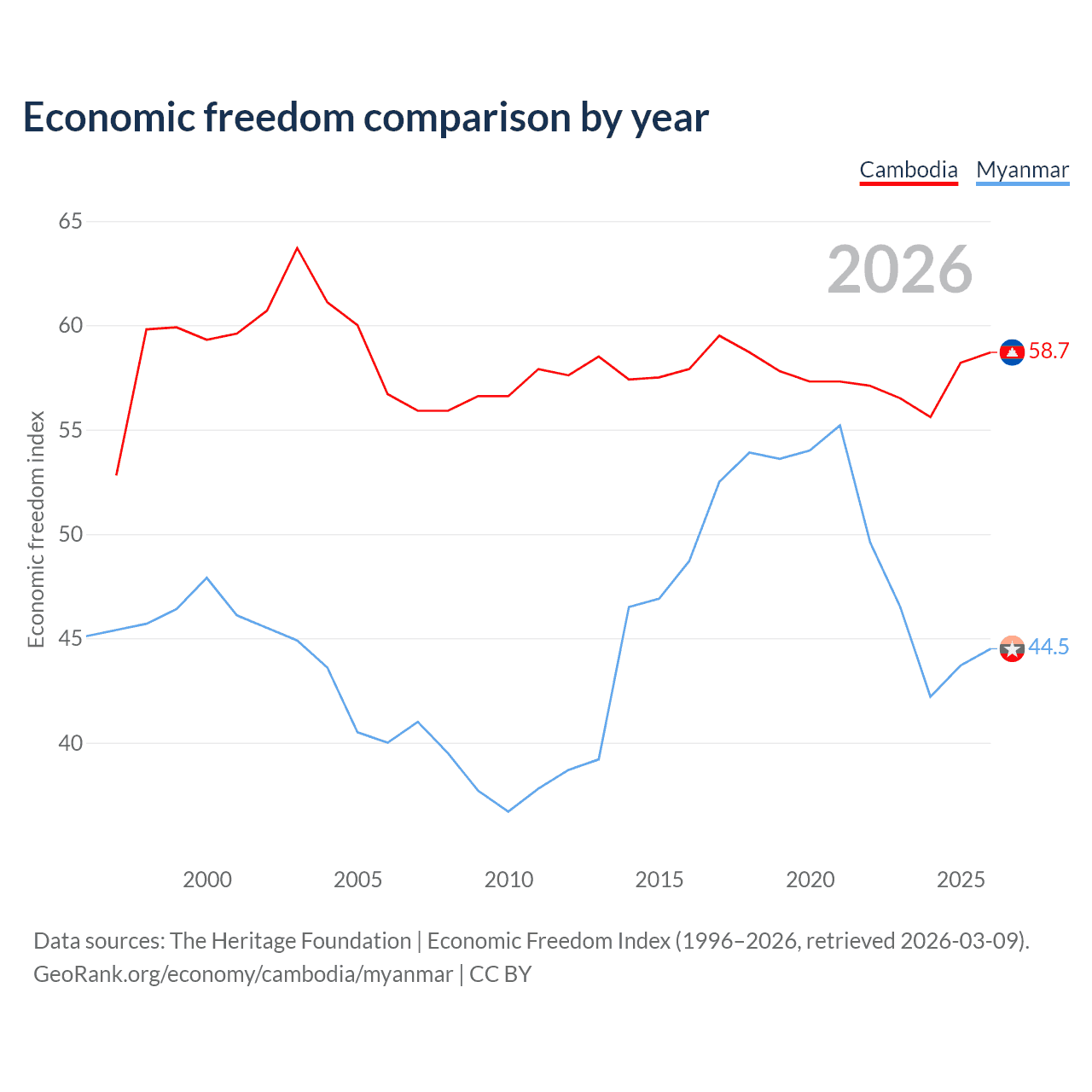 The Economic Freedom Index for Cambodia is 58.7, ranking 108/197, compared to 44.5 for Myanmar, ranking 180/197. The chart above displays a comparison of annual changes in economic freedom indexes.