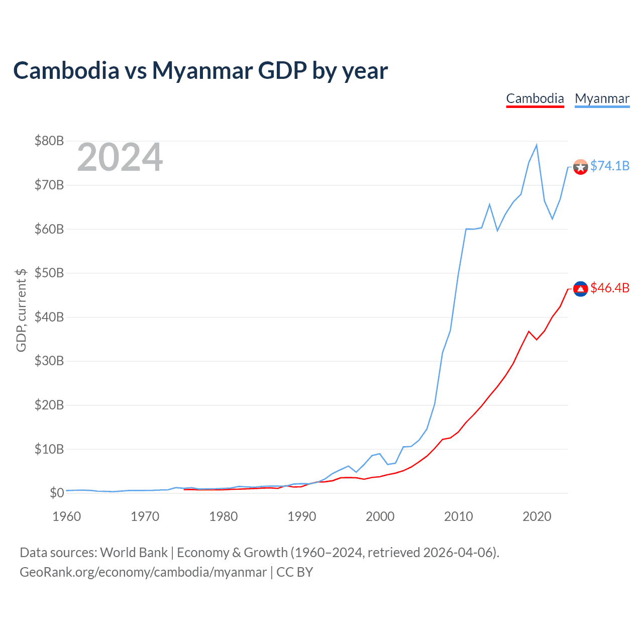 Cambodia has a GDP of $46.4B compared to $74.1B for Myanmar, ranking 97/197 and 85/197 by economy size, respectively.