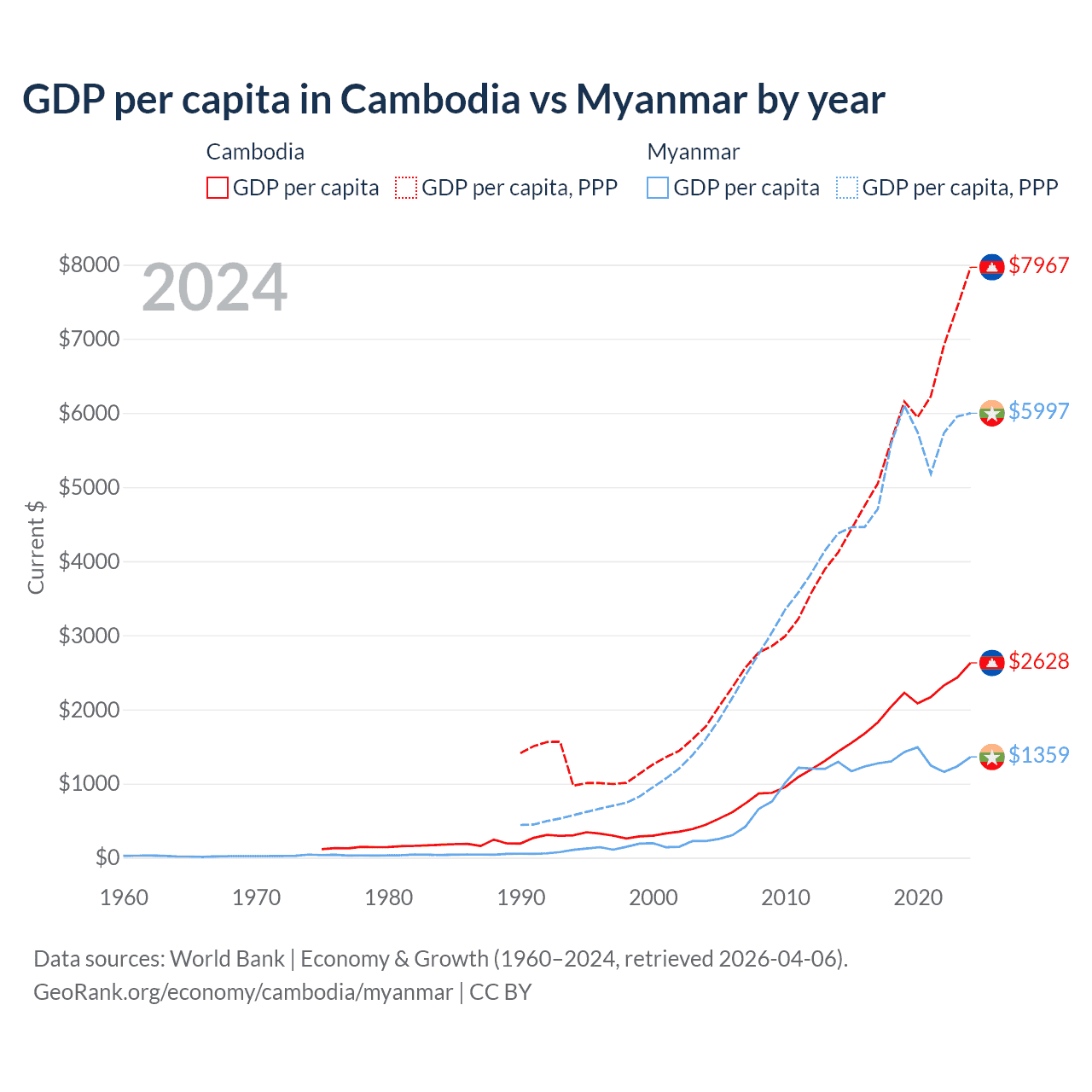 GDP per capita in Cambodia vs Myanmar by year
