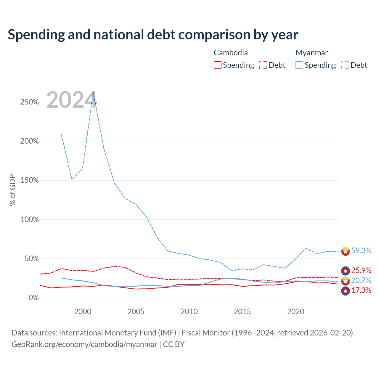 Cambodia has $12B in government debt (25.9% of GDP), compared to $44B (59.3% of GDP) in Myanmar.