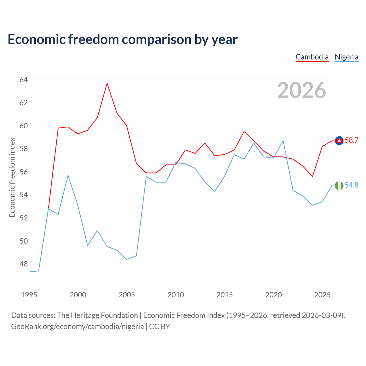 The Economic Freedom Index for Cambodia is 58.7, ranking 108/197, compared to 54.8 for Nigeria, ranking 132/197. The chart above displays a comparison of annual changes in economic freedom indexes.