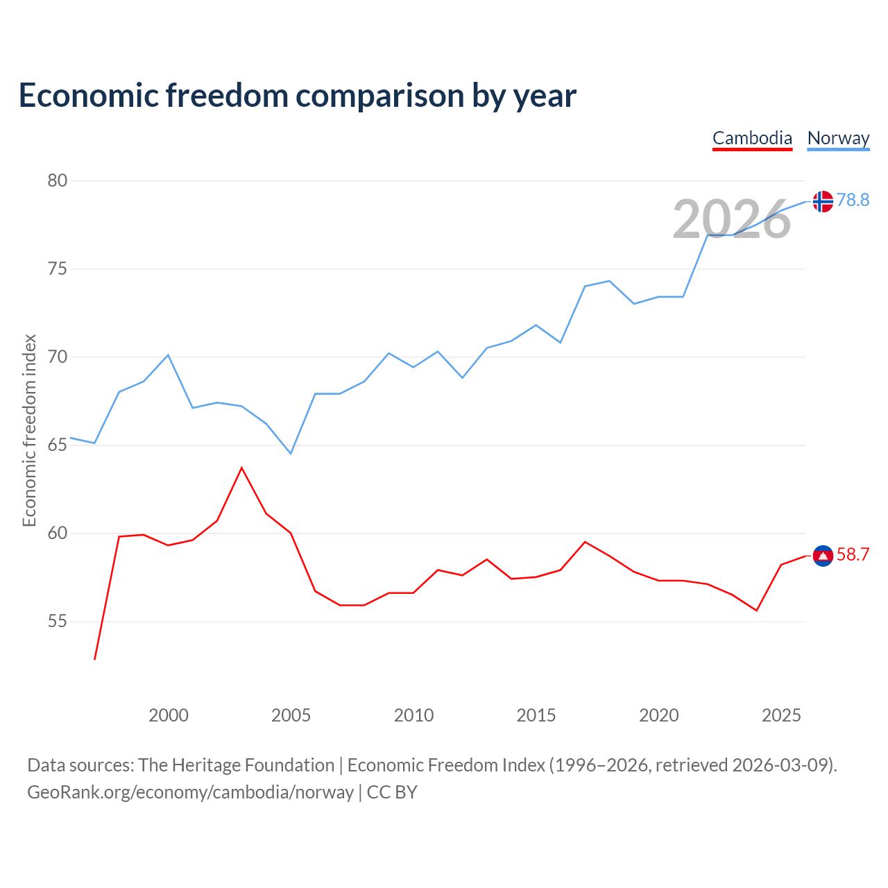 The Economic Freedom Index for Cambodia is 58.7, ranking 108/197, compared to 78.8 for Norway, ranking 9/197. The chart above displays a comparison of annual changes in economic freedom indexes.