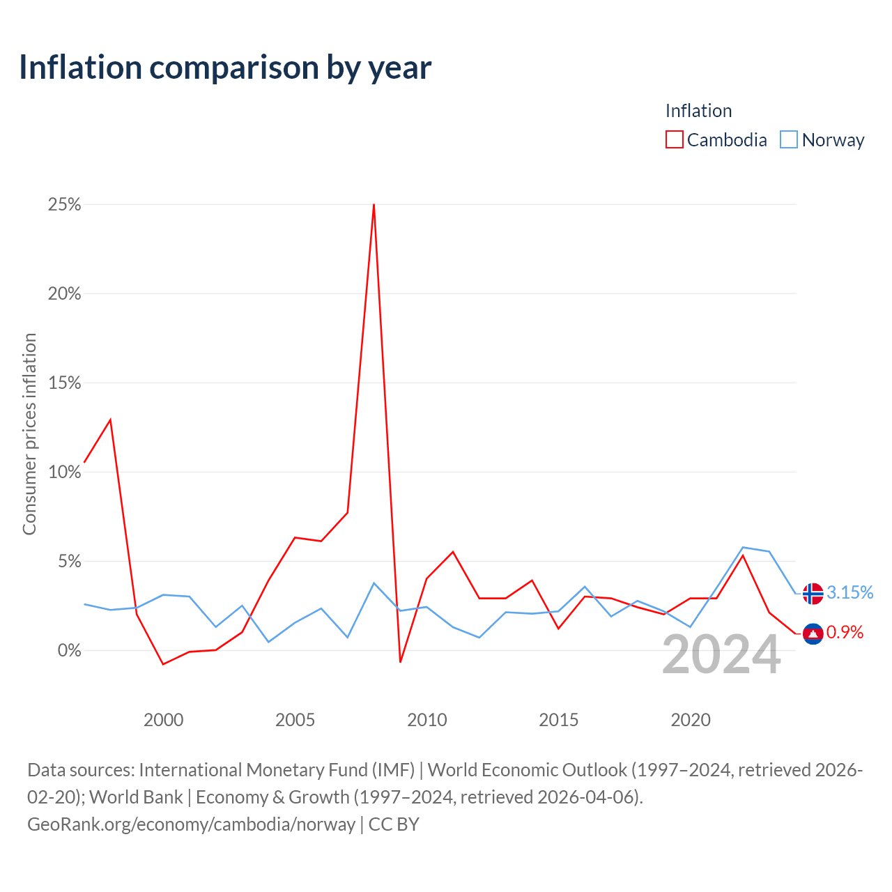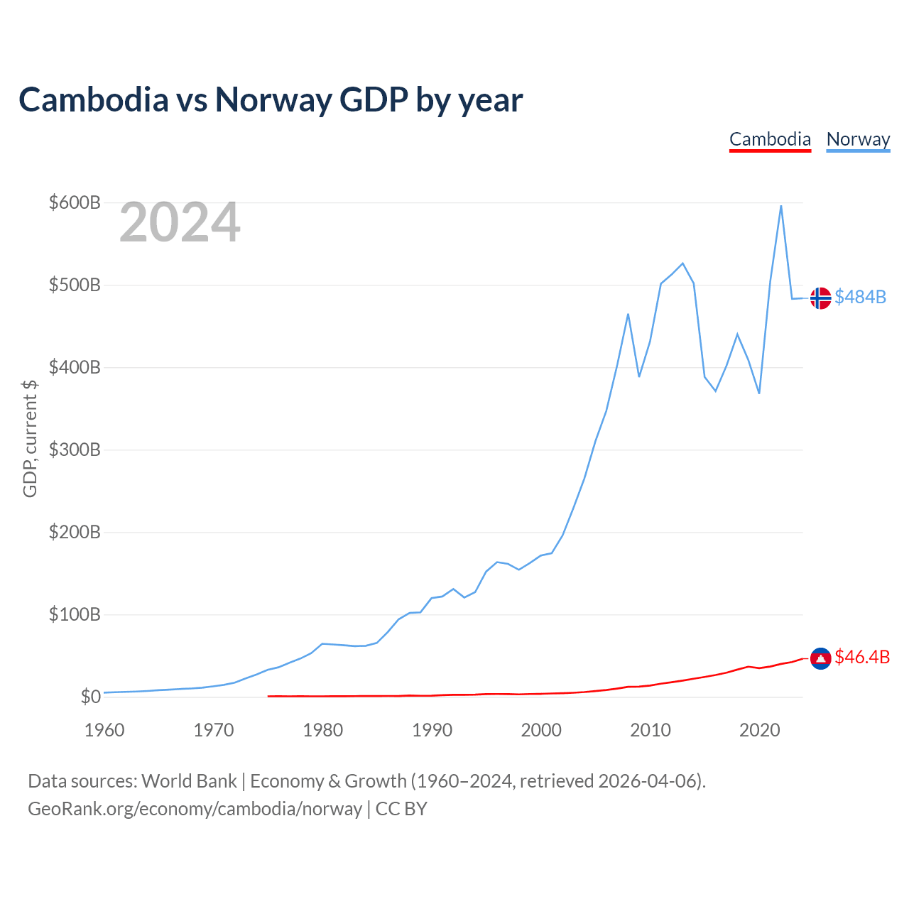 Cambodia has a GDP of $46.4B compared to $484B for Norway, ranking 97/197 and 32/197 by economy size, respectively.