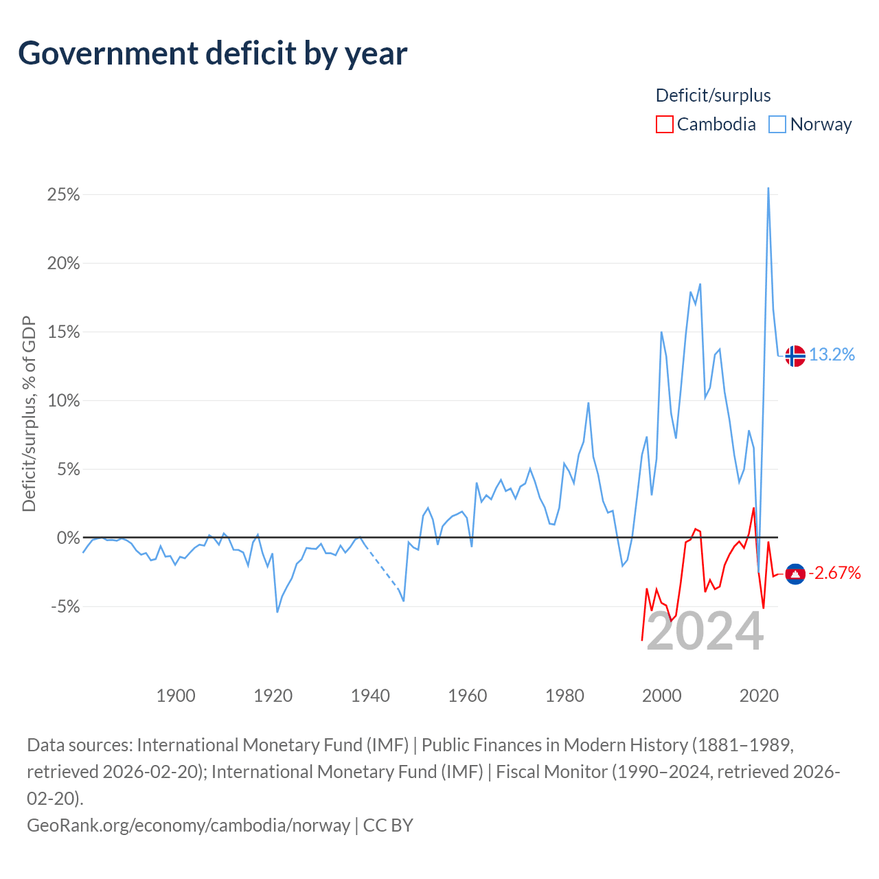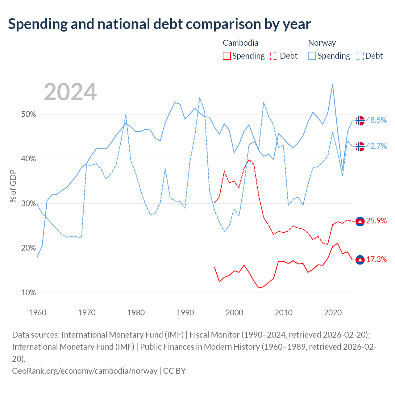 Cambodia has $12B in government debt (25.9% of GDP), compared to $207B (42.7% of GDP) in Norway.