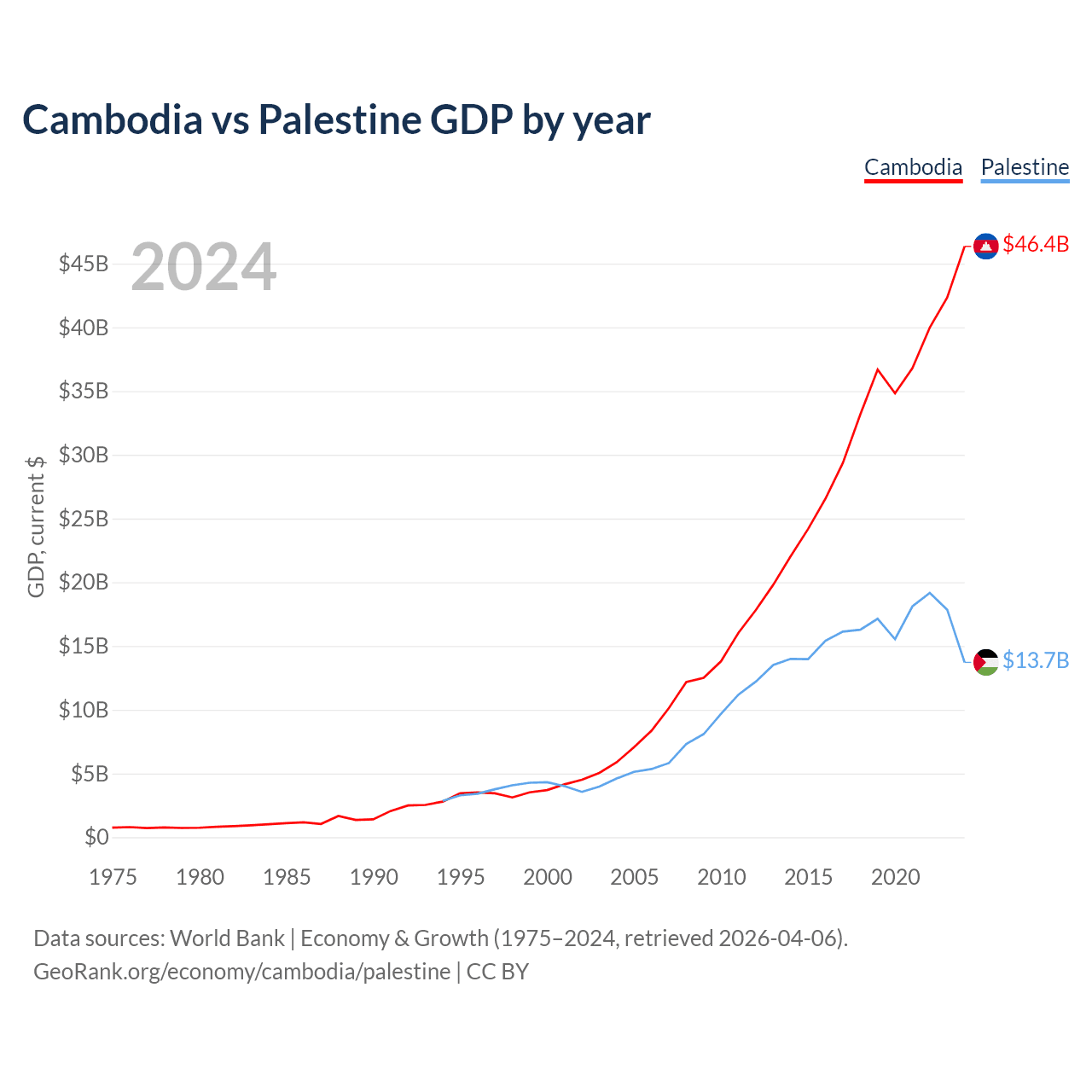 Cambodia vs Palestine GDP by year