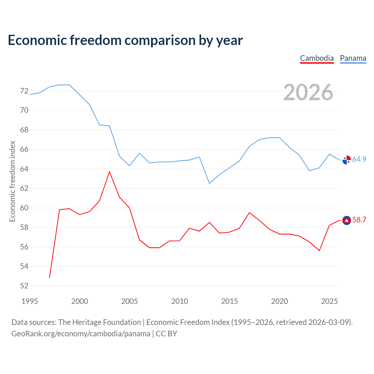The Economic Freedom Index for Cambodia is 58.7, ranking 108/197, compared to 64.9 for Panama, ranking 70/197. The chart above displays a comparison of annual changes in economic freedom indexes.