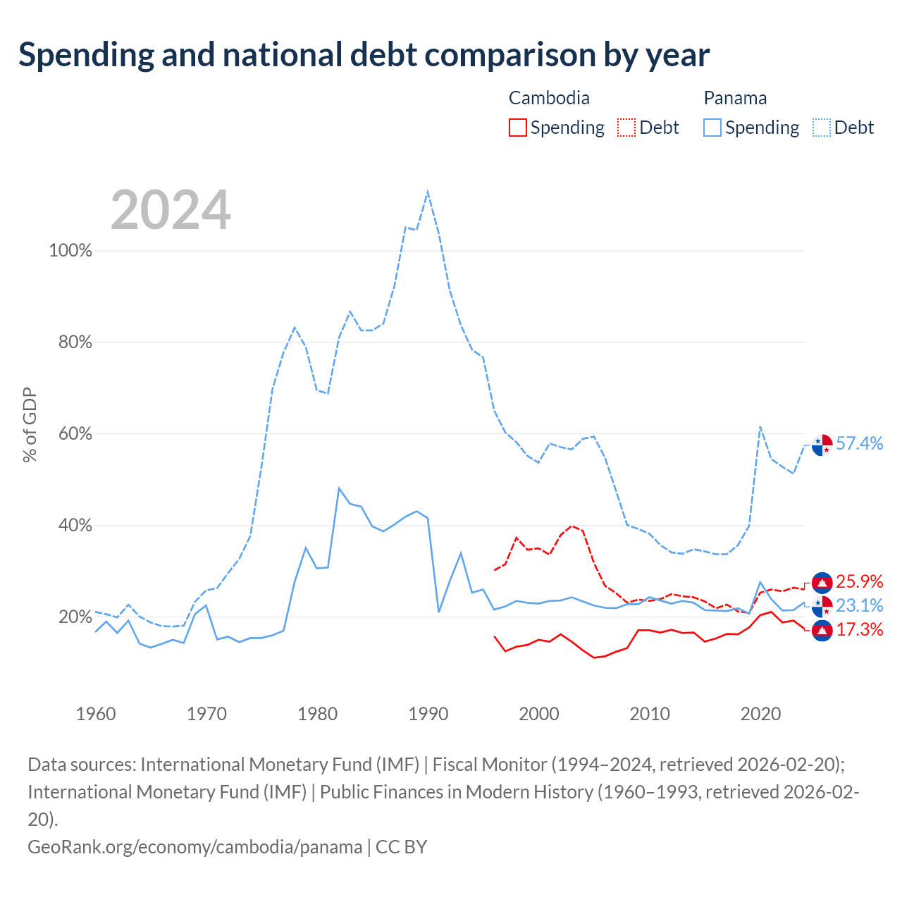 Cambodia has $12B in government debt (25.9% of GDP), compared to $49.6B (57.4% of GDP) in Panama.