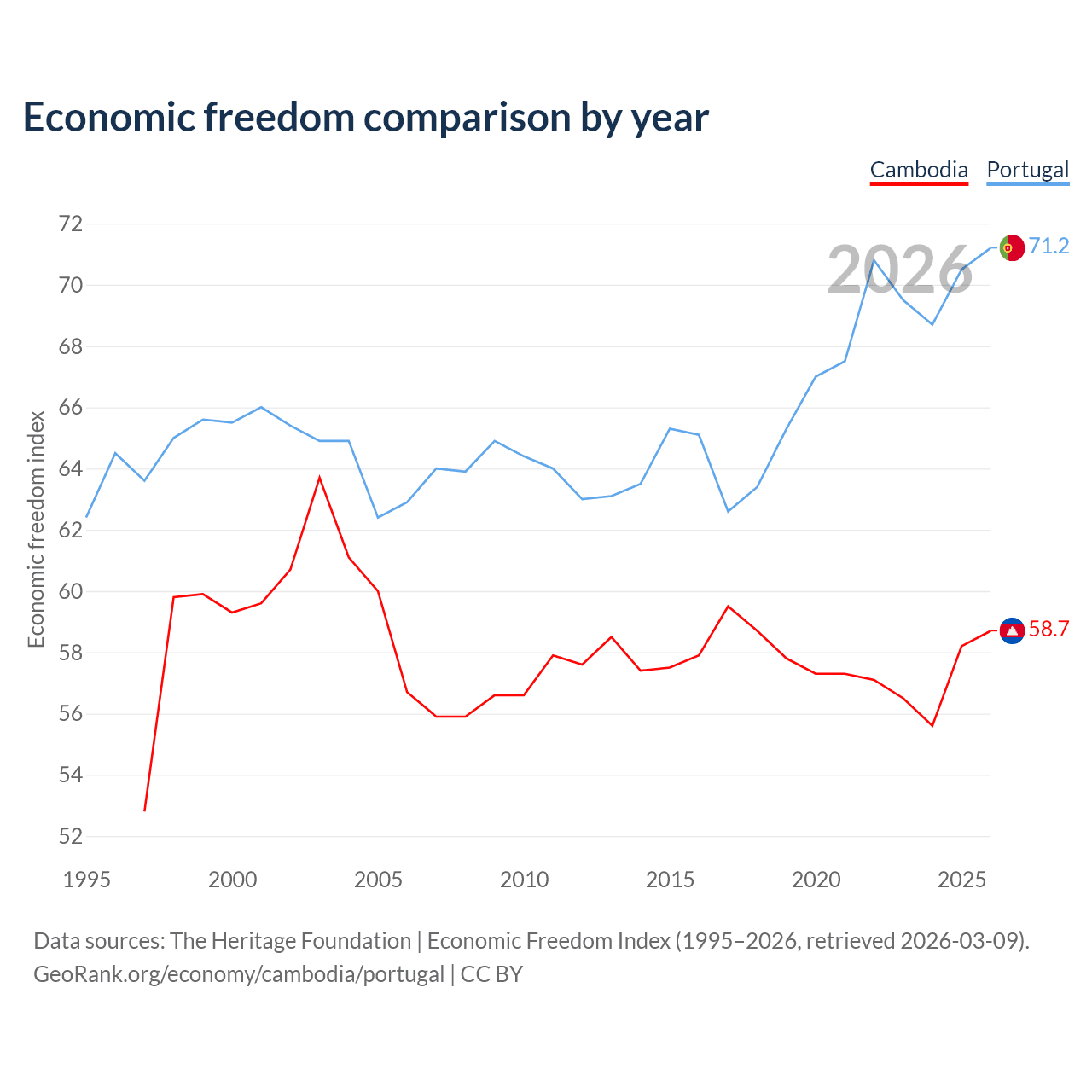 The Economic Freedom Index for Cambodia is 58.7, ranking 108/197, compared to 71.2 for Portugal, ranking 33/197. The chart above displays a comparison of annual changes in economic freedom indexes.