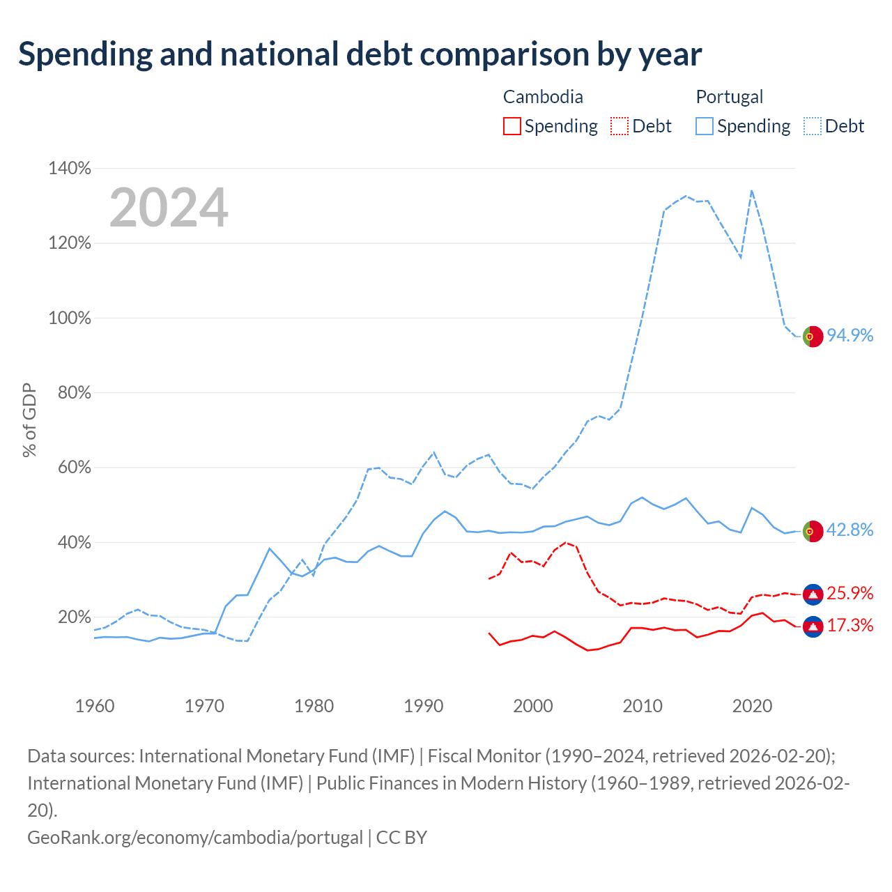 Cambodia has $12B in government debt (25.9% of GDP), compared to $297B (94.9% of GDP) in Portugal.