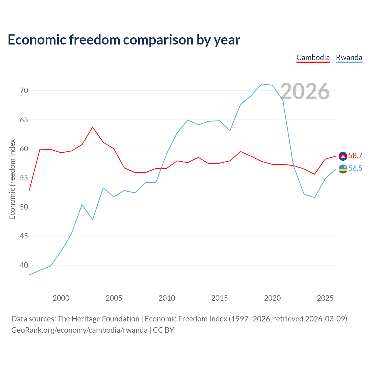 The Economic Freedom Index for Cambodia is 58.7, ranking 108/197, compared to 56.5 for Rwanda, ranking 121/197. The chart above displays a comparison of annual changes in economic freedom indexes.