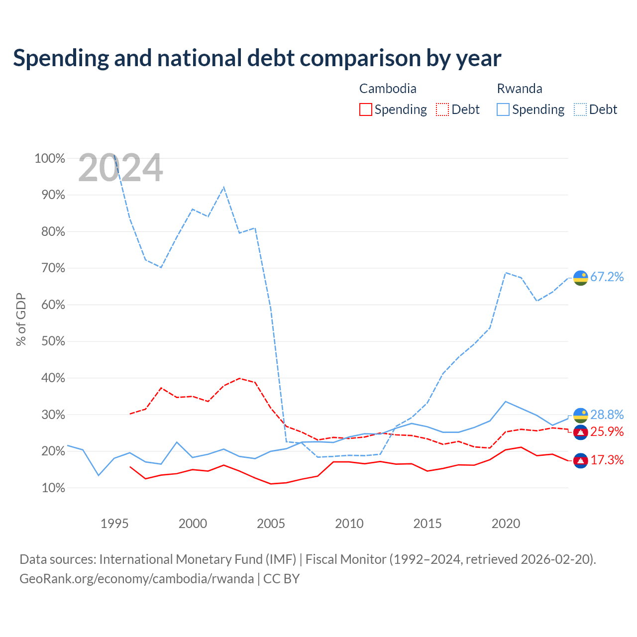 Cambodia has $12B in government debt (25.9% of GDP), compared to $9.58B (67.2% of GDP) in Rwanda.