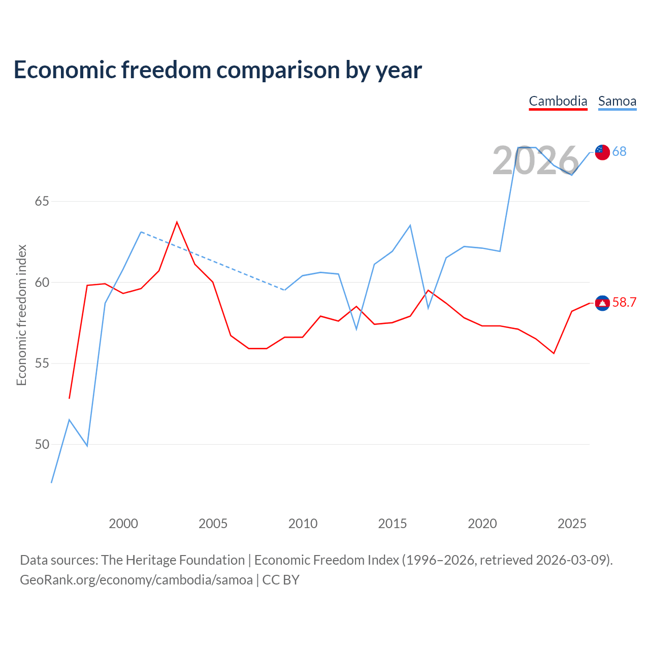 The Economic Freedom Index for Cambodia is 58.7, ranking 108/197, compared to 68 for Samoa, ranking 52/197. The chart above displays a comparison of annual changes in economic freedom indexes.