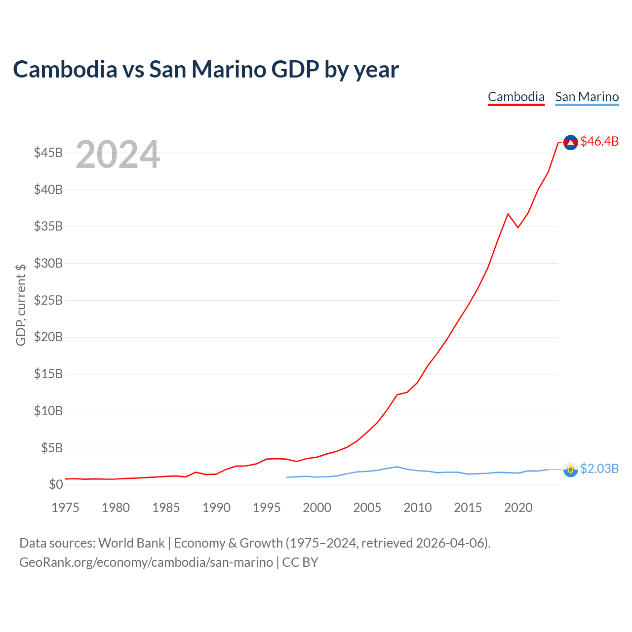 Cambodia has a GDP of $46.4B compared to $2.03B for San Marino, ranking 97/197 and 180/197 by economy size, respectively.