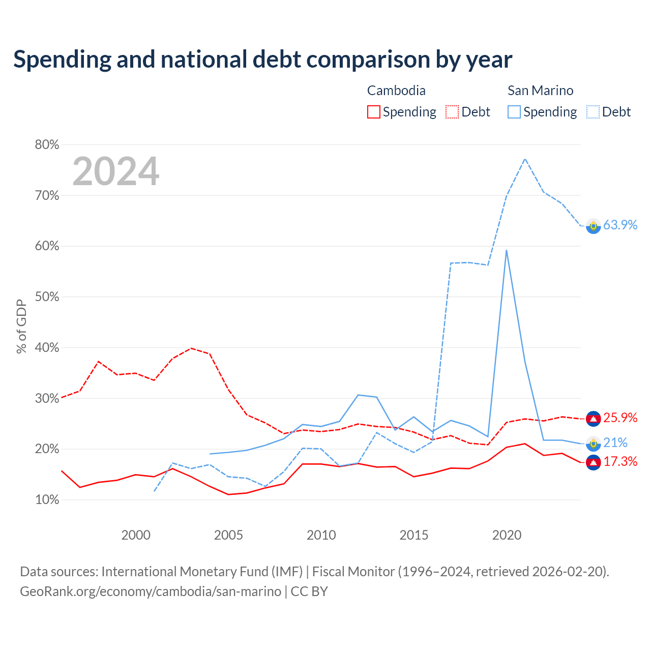 Cambodia has $12B in government debt (25.9% of GDP), compared to $1.39B (63.9% of GDP) in San Marino.