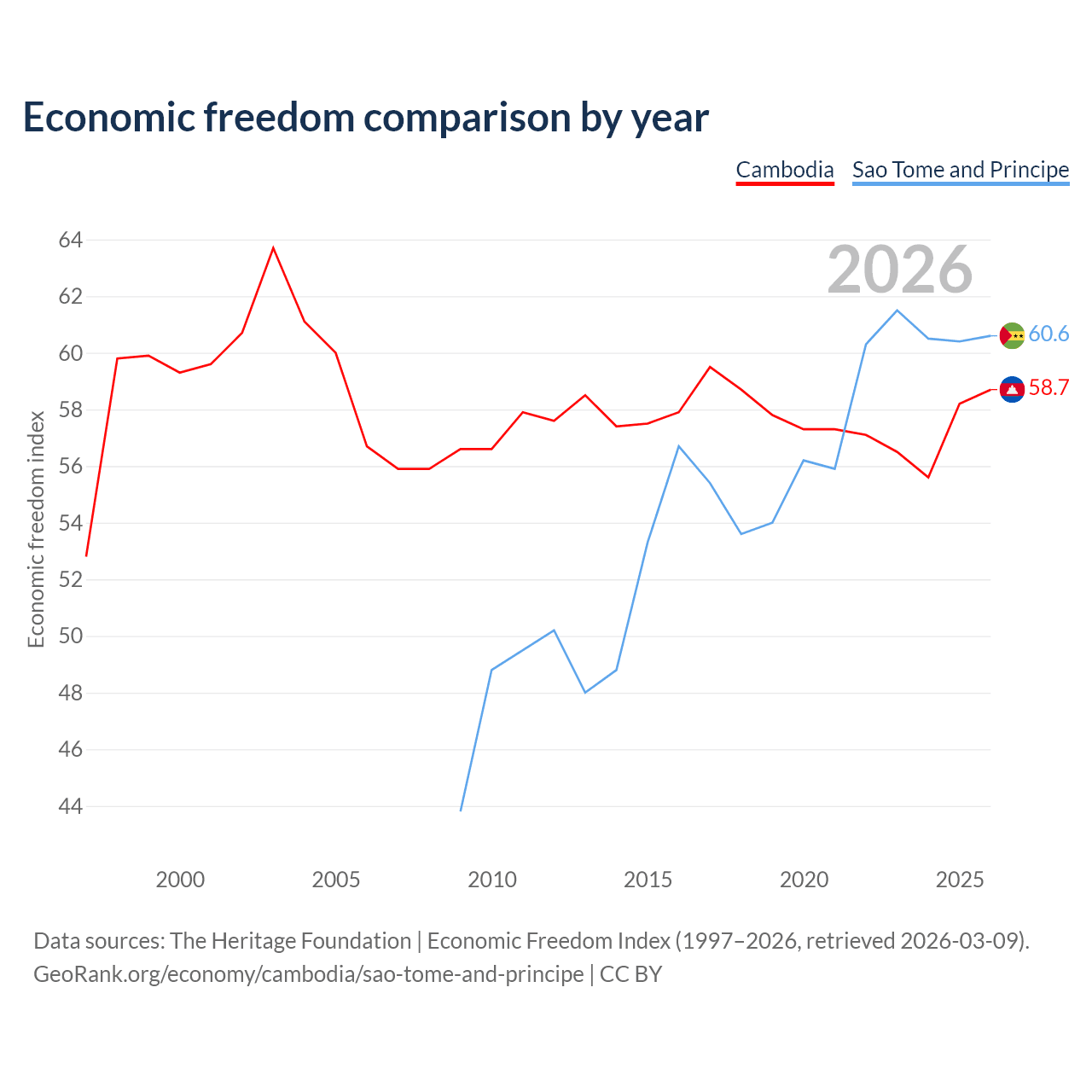 The Economic Freedom Index for Cambodia is 58.7, ranking 108/197, compared to 60.6 for Sao Tome and Principe, ranking 93/197. The chart above displays a comparison of annual changes in economic freedom indexes.