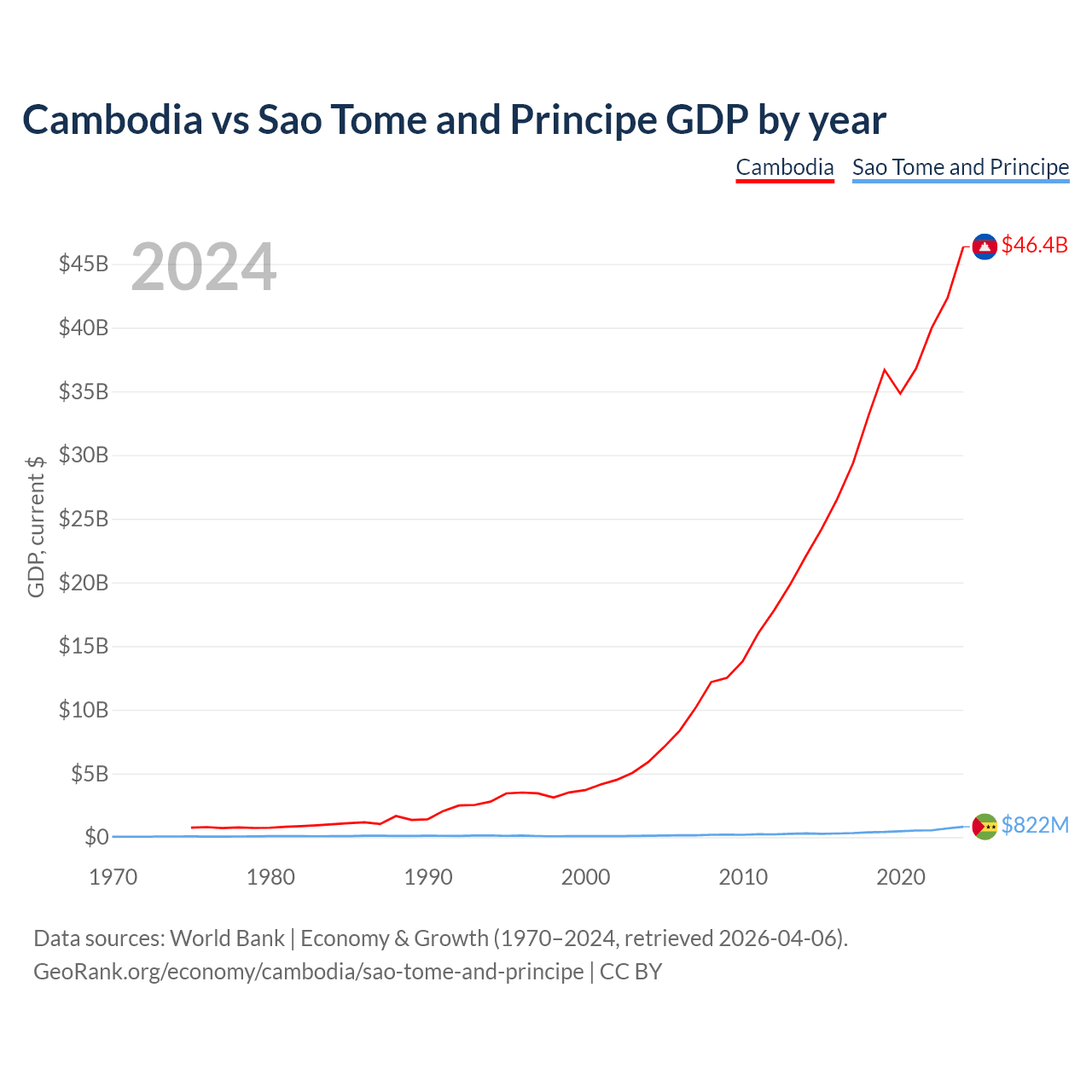 Cambodia has a GDP of $46.4B compared to $822M for Sao Tome and Principe, ranking 97/197 and 189/197 by economy size, respectively.