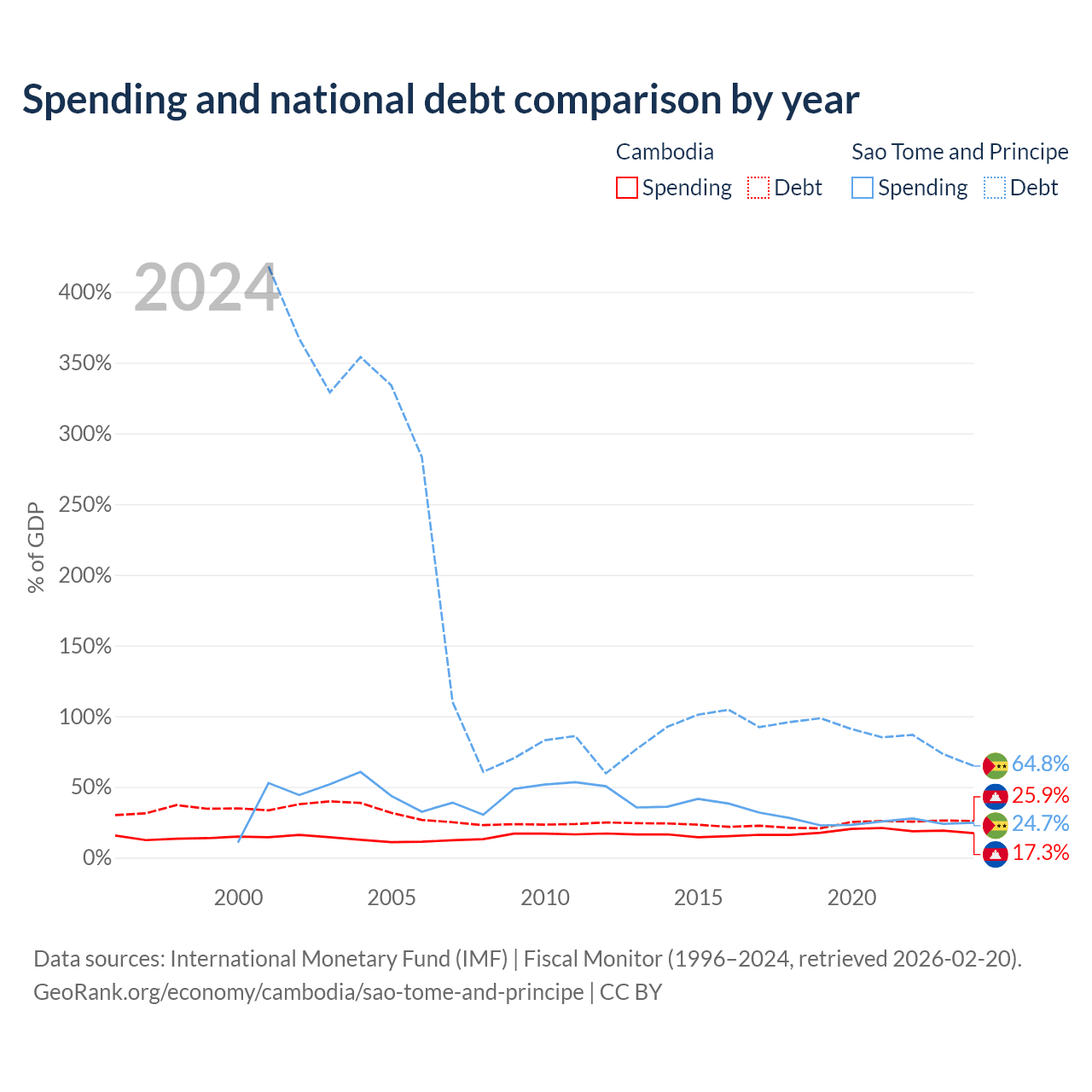 Cambodia has $12B in government debt (25.9% of GDP), compared to $533M (64.8% of GDP) in Sao Tome and Principe.