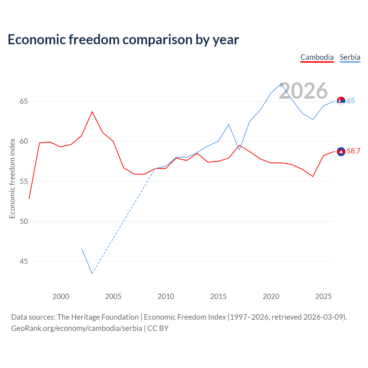 The Economic Freedom Index for Cambodia is 58.7, ranking 108/197, compared to 65 for Serbia, ranking 68/197. The chart above displays a comparison of annual changes in economic freedom indexes.