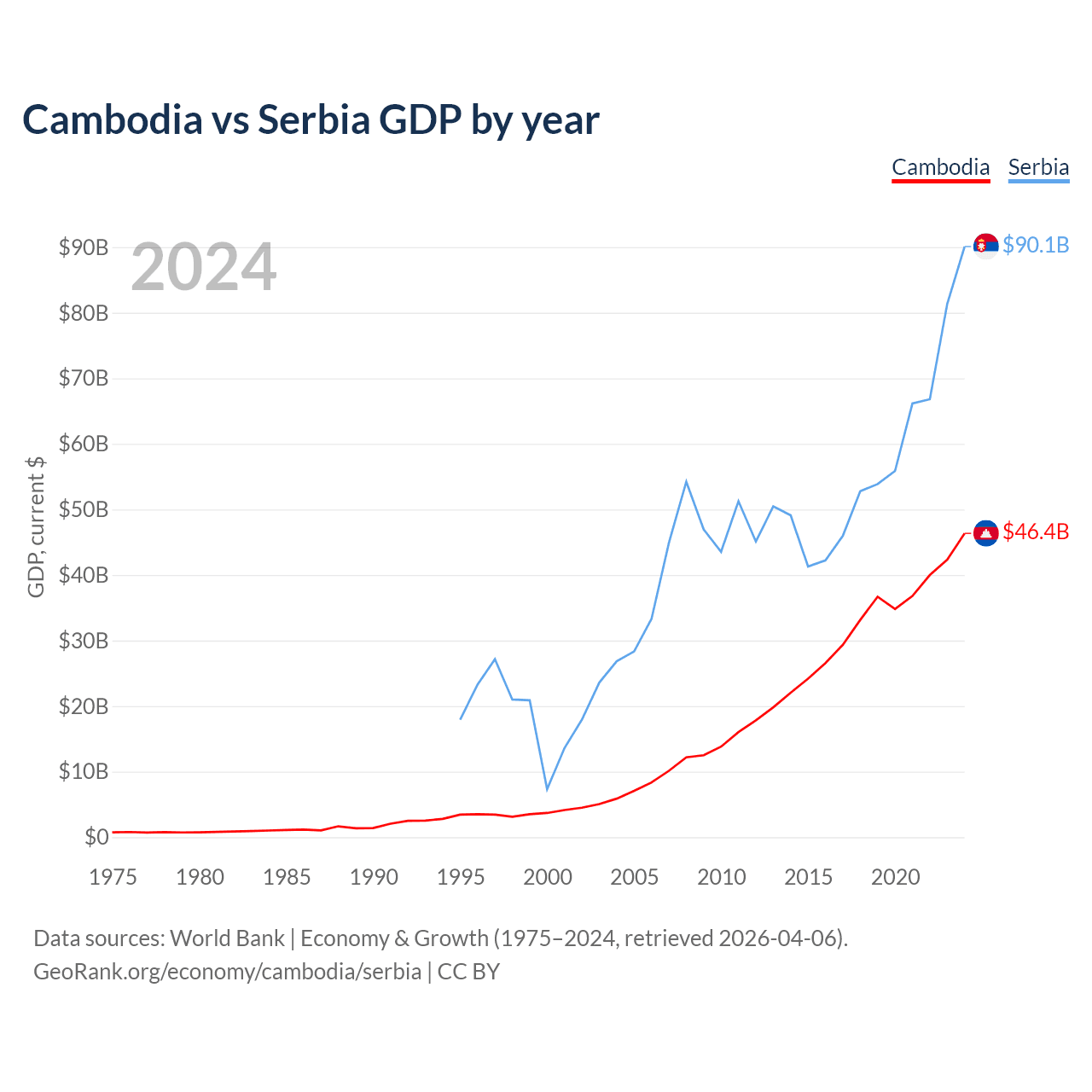 Cambodia has a GDP of $46.4B compared to $90.1B for Serbia, ranking 97/197 and 76/197 by economy size, respectively.