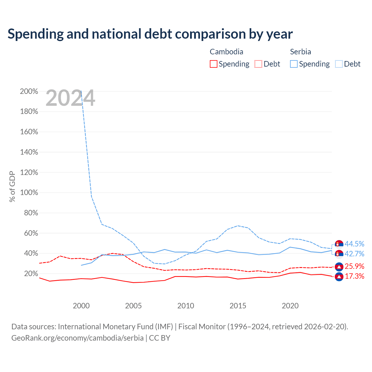 Cambodia has $12B in government debt (25.9% of GDP), compared to $40.1B (44.5% of GDP) in Serbia.