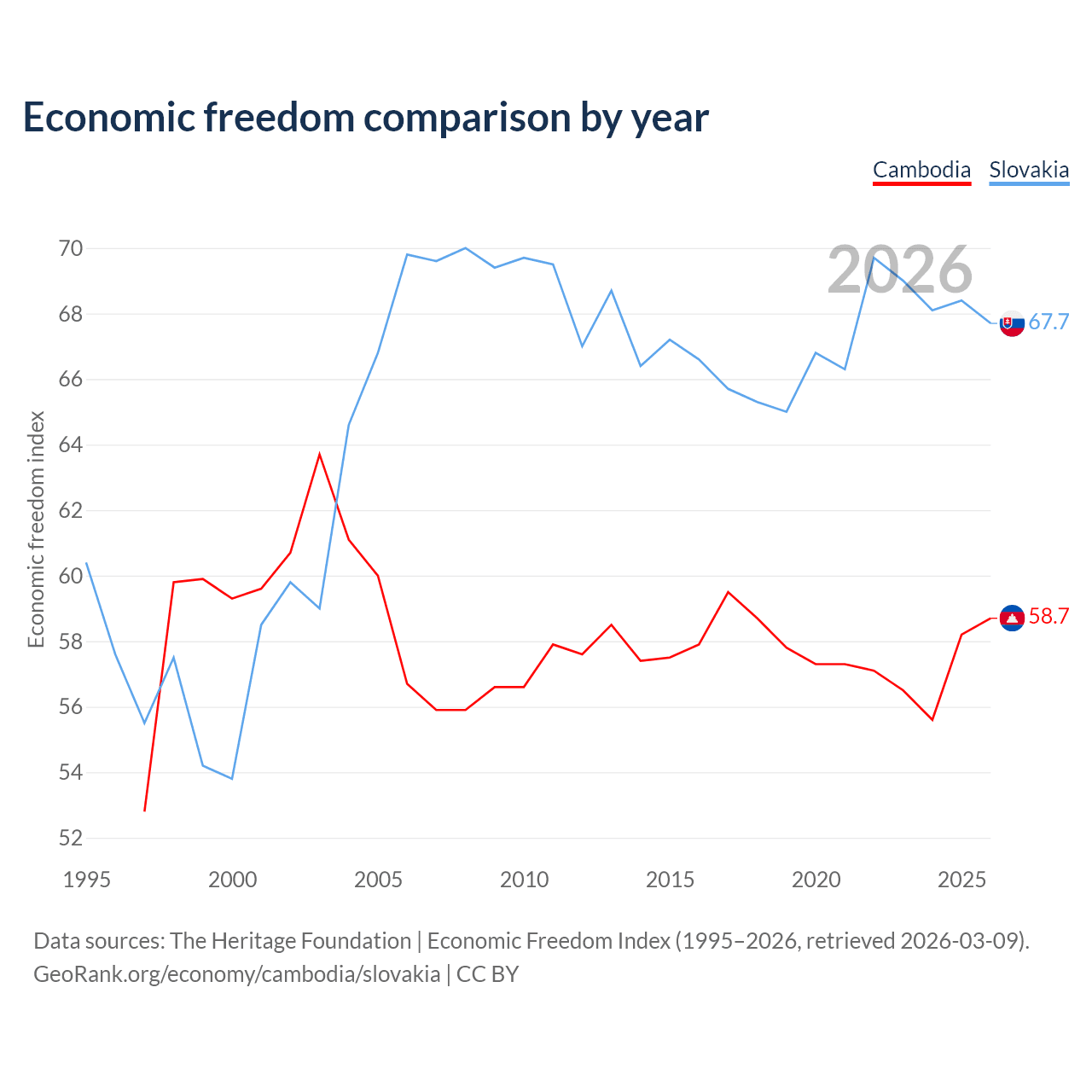 The Economic Freedom Index for Cambodia is 58.7, ranking 108/197, compared to 67.7 for Slovakia, ranking 54/197. The chart above displays a comparison of annual changes in economic freedom indexes.