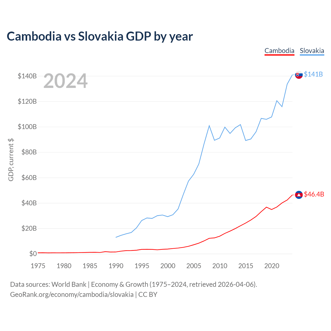 Cambodia has a GDP of $46.4B compared to $141B for Slovakia, ranking 97/197 and 61/197 by economy size, respectively.